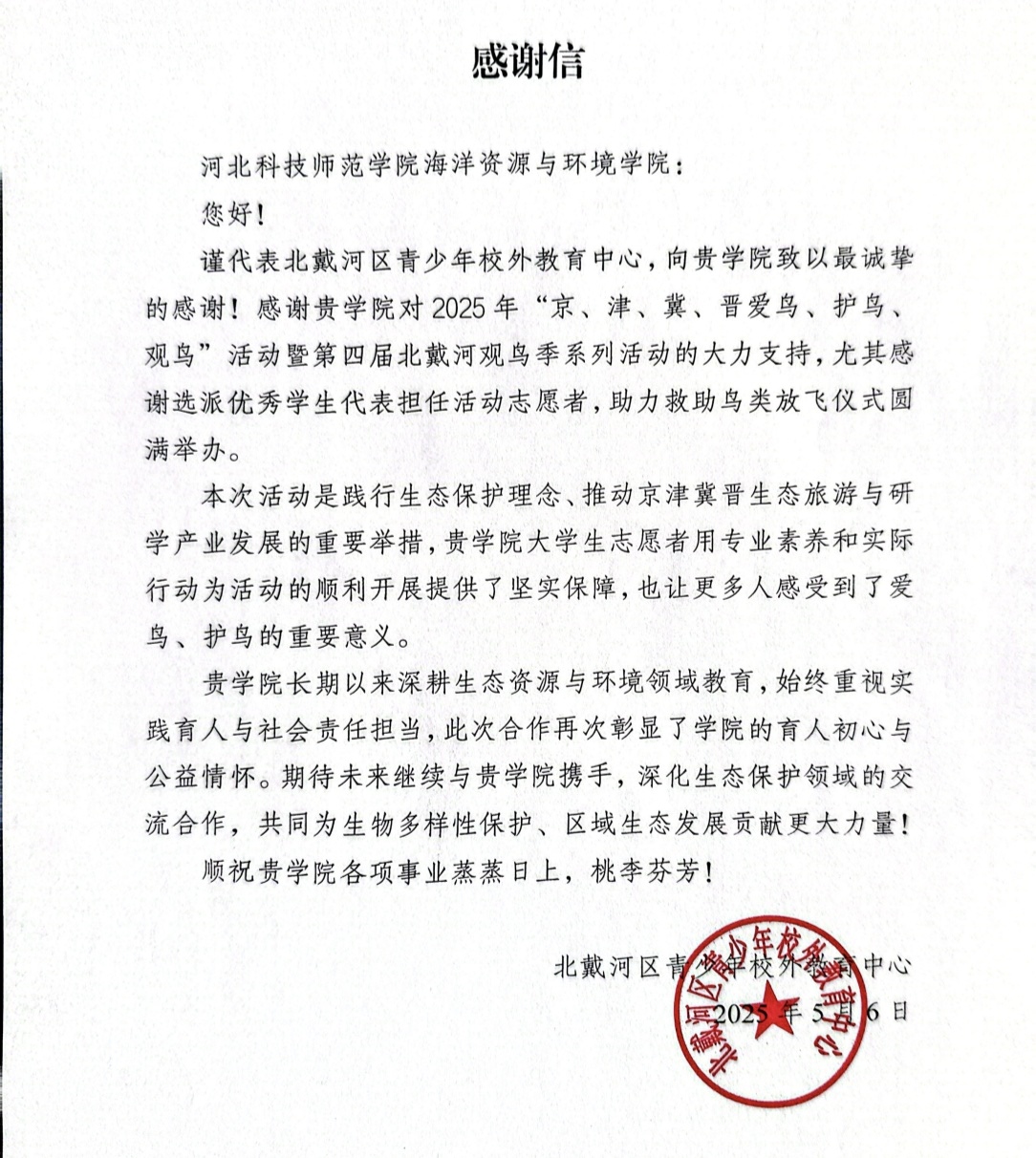 感谢信中特别提及,学院长期深耕生态资源与环境领域教育,始终重视实践育人与社会责任担当,此次合作充分彰显了学院的育人初心与公益情怀。同时,北戴河区青少年校外教育中心也期待未来能与学院继续携手,在生物多样性保护、区域生态发展等领域深化交流合作,凝聚更多生态保护合力。