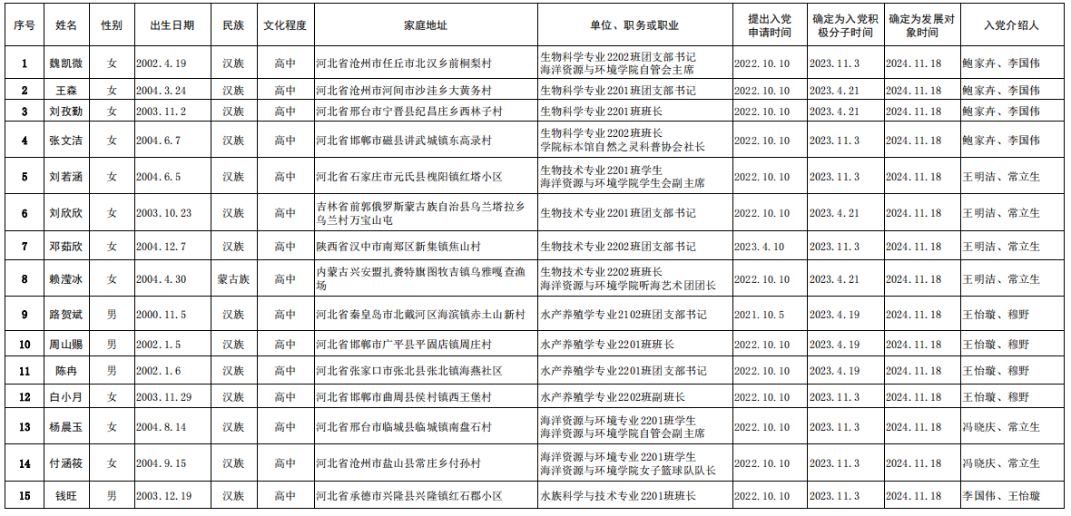 党支部通过广泛征求党员和群众意见、同发展对象谈话、听取入党介绍人意见、函调等对魏凯微等15名同志进行严格审查。根据党章和发展党员工作有关要求,现将其有关情况公示如下: