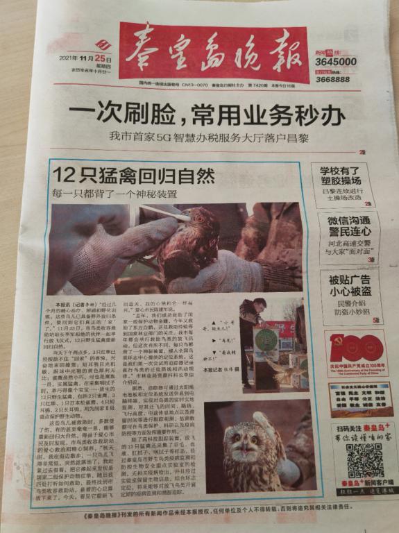 2021年11月25日,《秦皇岛晚报》以《12只猛禽回归自然》为题,报道了我院杜利强老师参与的秦皇岛鸟类迁徙保护工作,全文如下: