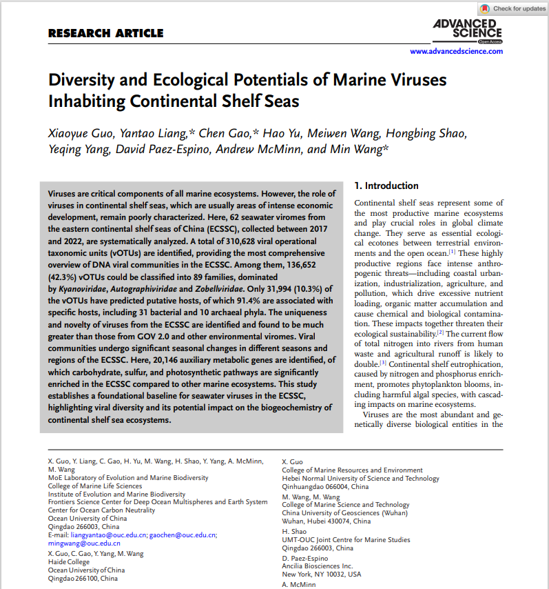 AC米兰中文官方网站郭晓月博士研究成果发表在知名学术期刊《Advanced Science》,在陆架海病毒领域取得新进展