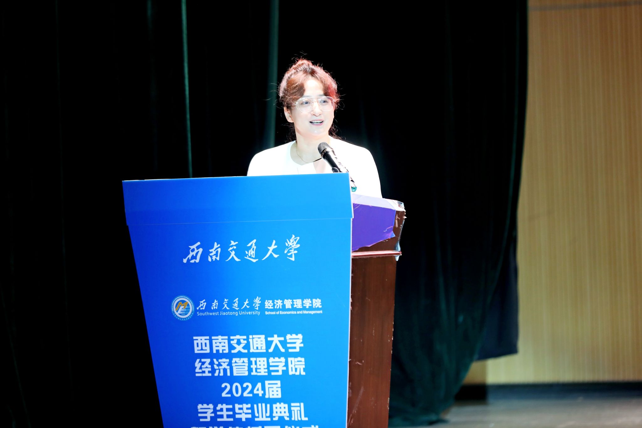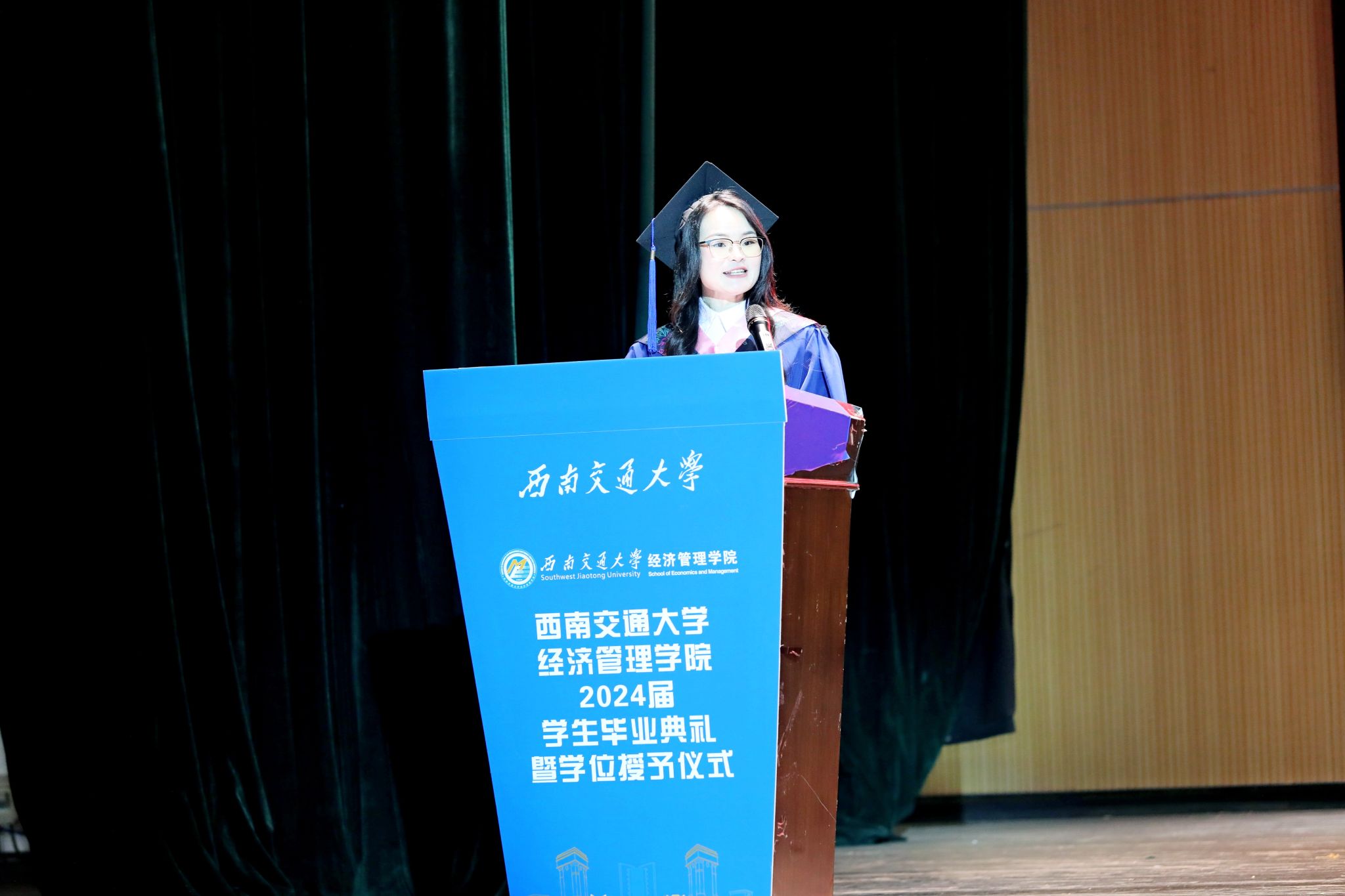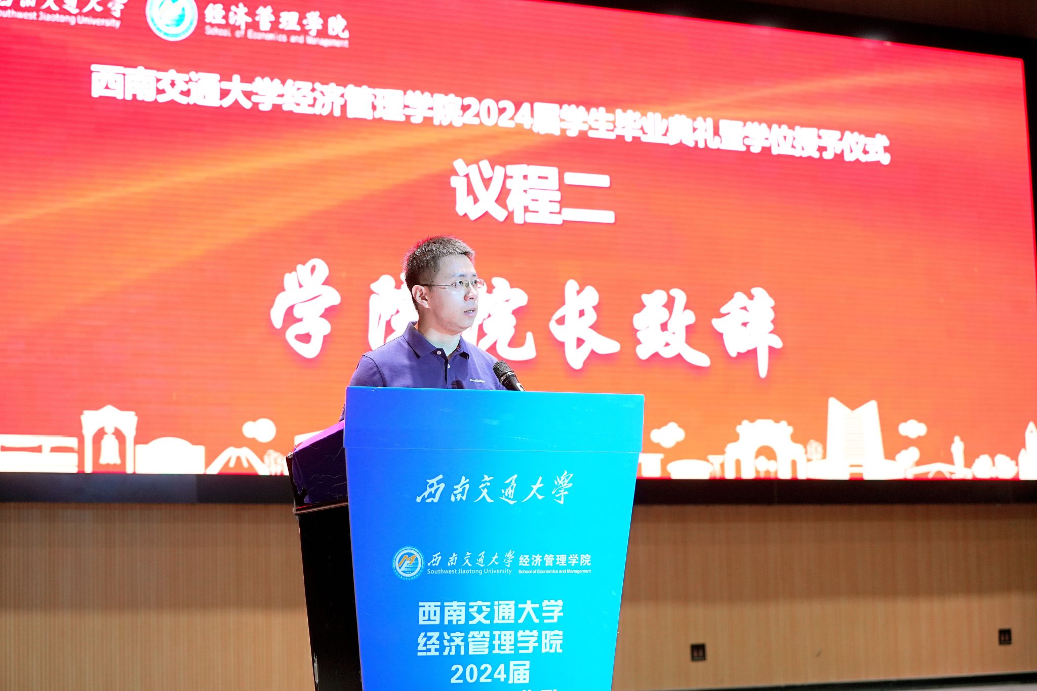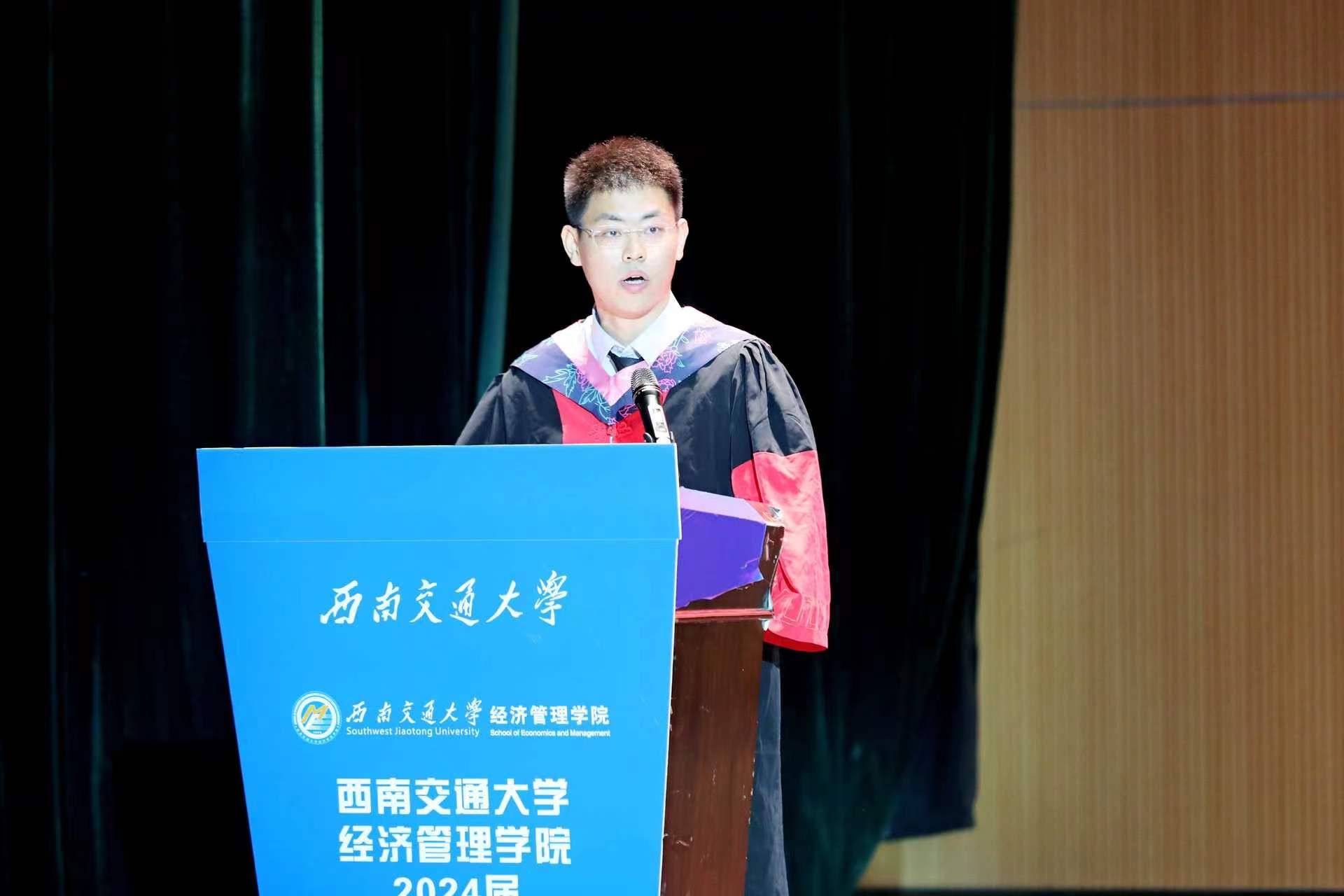 首先,学院院长韩科为典礼致辞。他代表今年会全体师生,向全院2024届毕业生表示热烈祝贺,并对他们在学院学习期间所取得的成绩给予高度认可。临别之际,他强调,希望同学们时刻谨记校训、院训,发扬交大精神,展现交大学子的担当。同时,韩院长为毕业生们提出了三点建议:一是提升境界的高度,二是拓展胸怀的广度,三是加深信念的深度,希望毕业生们带着学院的关心关怀,无惧风雨,奋勇前进,学院永远是经管学子们温馨的家。字字句句间,都寄托着对全体毕业生的深情嘱托与美好祝愿。