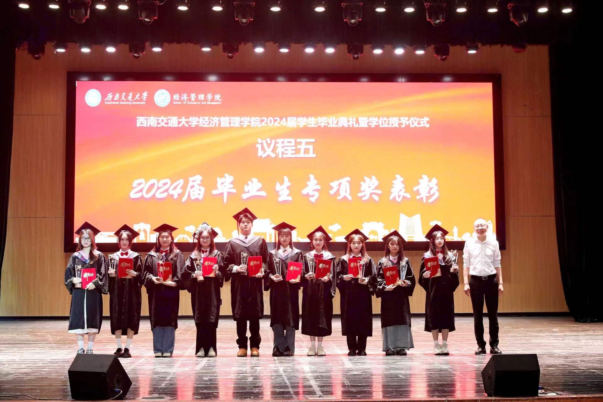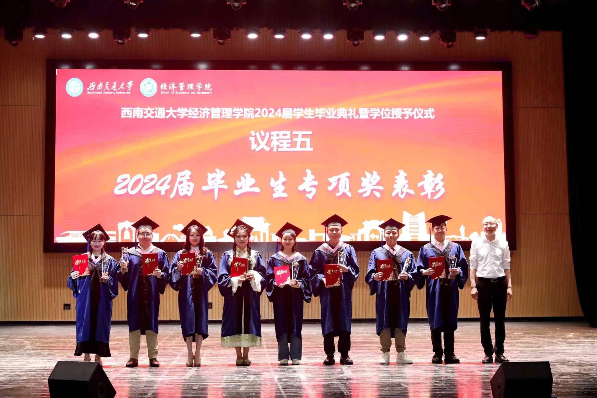 学院党委书记郭强宣读2024届本科生专项奖表彰名单、2024届MBA优秀毕业生名单,副院长李良为获奖毕业生颁奖。