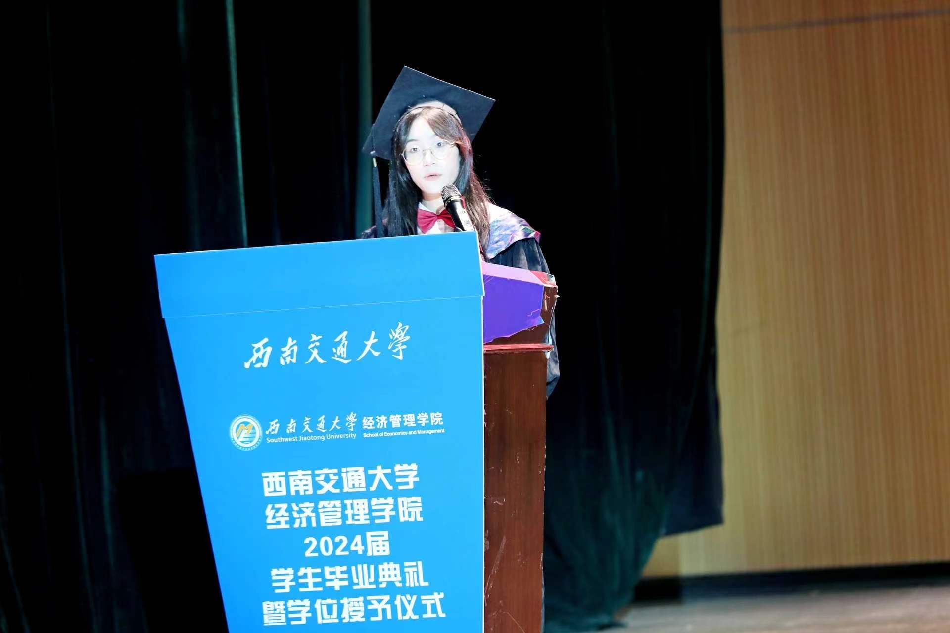 本科生毕业生代表林洁、研究生毕业生代表席悦、MBA毕业生代表王胜男分别发言。林洁回顾了自己的大学生活和成长经历,而席悦则分享了自己在硕博阶段学术和实践方面的满满收获,同时着重强调了青年人肩负的神圣使命;王胜男明确指出了持续学习和价值创造的重要性,还特别提到交大MBA多学科赋能人才的特色。三位毕业生都表达了对学院及老师的感激之情,并送上了对学院的美好祝愿。