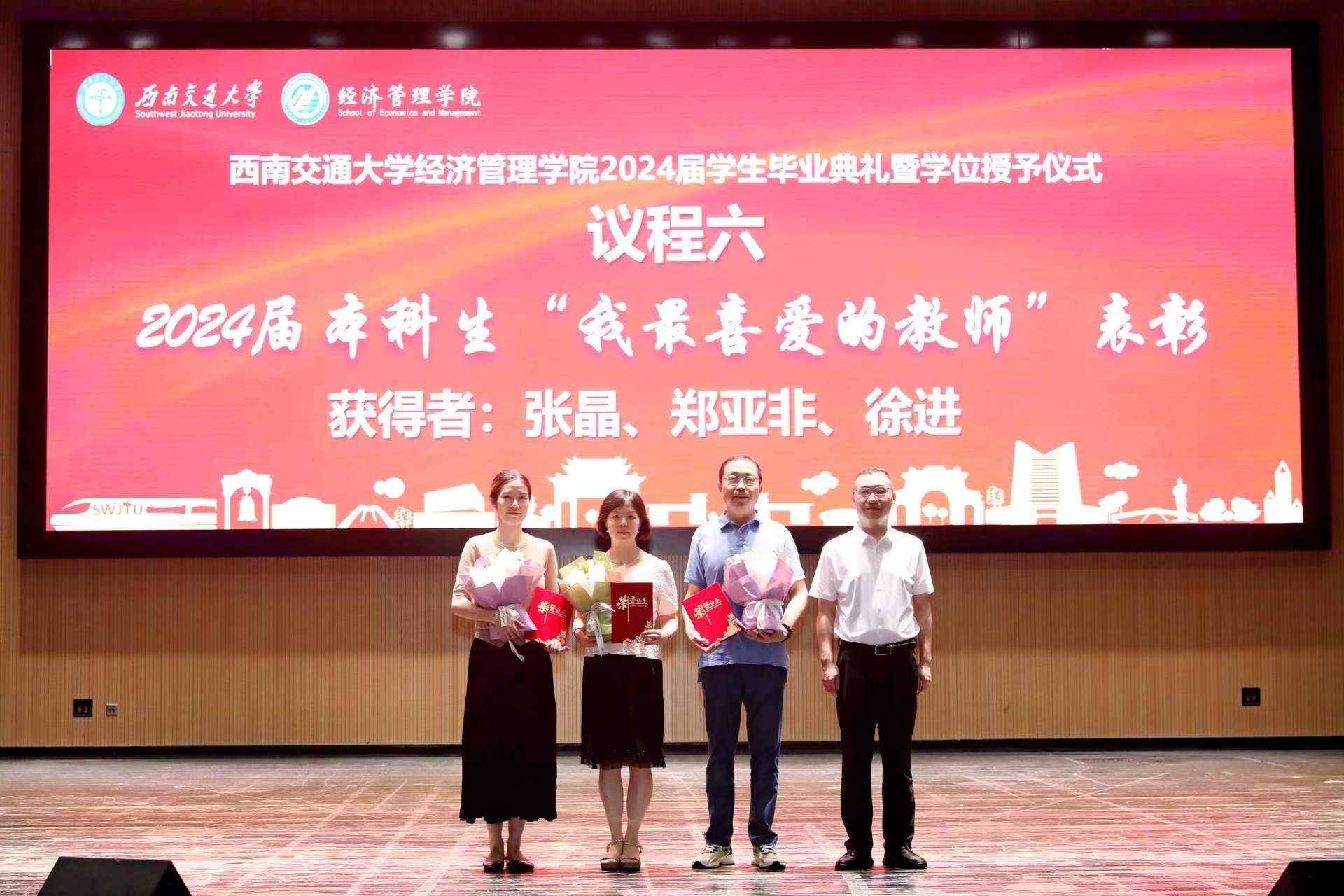学院院长韩科宣读2024届本科毕业生“我最喜爱的教师”获奖名单,获奖老师分别是:张晶、郑亚非、徐进,副院长聂佳佳为获奖教师颁奖。