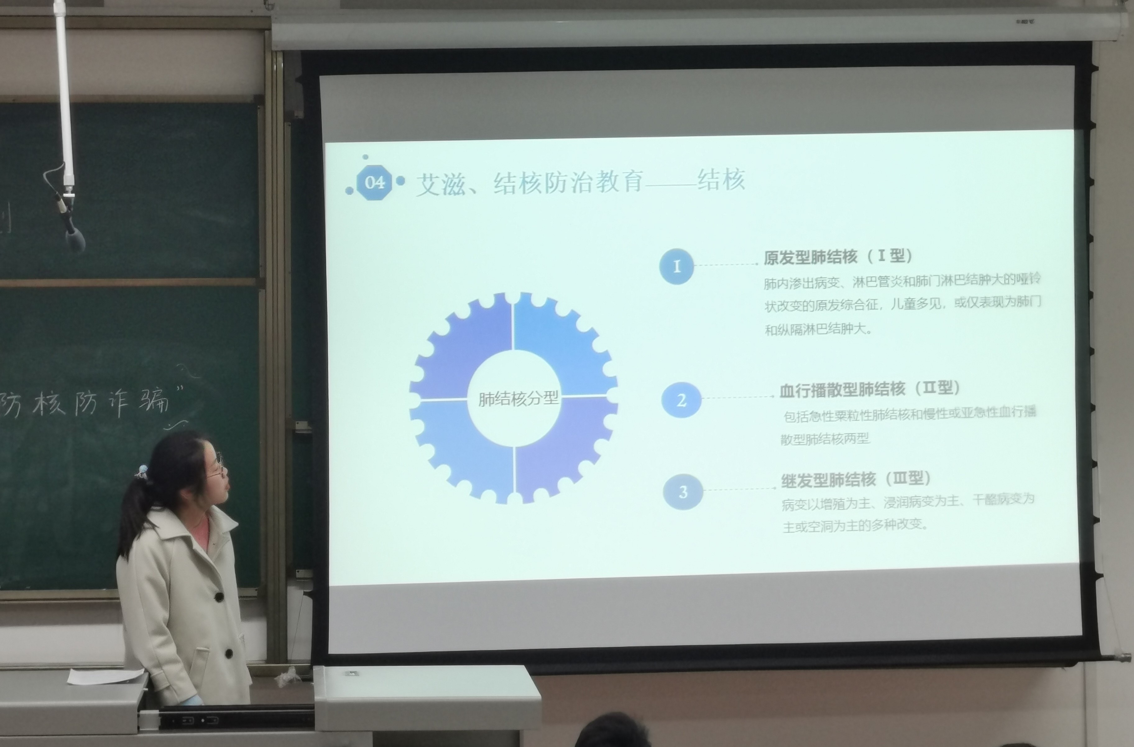 班长袁媛为大家科普了艾滋病和结核病的病因、临床表现、传播途径和预防手段等知识,叮嘱大家平时要注意加强身体锻炼,养成良好生活习惯,勤洗手多通风,做到有效预防疾病,避免疾病缠身。