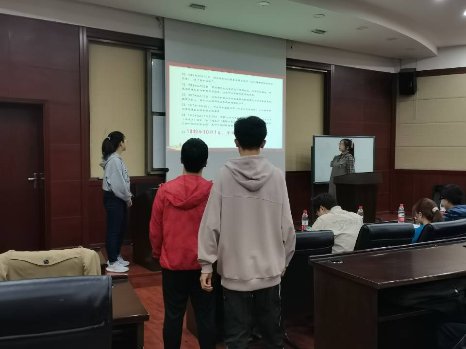 首先我们进行的是党史学习,在这一部分中,我们重温了1921-1949的各件重大历史事件,再次走进党的发展史,抗争史,进步史。一幕幕的情景展现在同学们眼前:召开会议时的思想碰撞、抗战的艰难,长征路上的辛苦。在这一部分中,主持人也邀请了同学们深情的叙读党史,让每一位同学都参与进来,加深了同学们对党的认识。