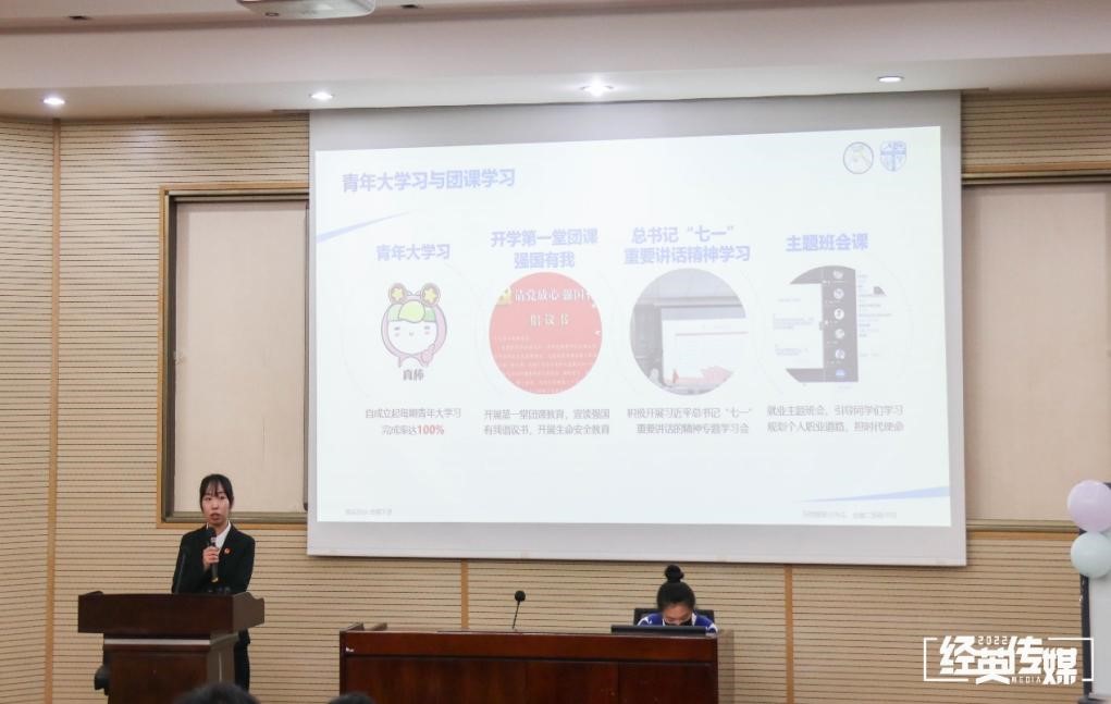 答辩分为两个环节,分别为班级成果展示和评委提问。班级成果展示包括视频创作展示和团日活动展示。首先是视频创作展示,各班用自制视频表达了对党的敬爱。大家在观看视频的过程中仿佛走过岁月,穿越时空,一起领略了党的风采,回顾了交大历史。随后,各班团支书展示了团日活动开展的前期准备、活动流程、宣传以及总结等,可以看出各班同学高度重视团日活动,并积极配合团支书工作,参与到活动的筹备和开展中去。通过7位团支书的精彩答辩,大家看到了各支部在提升组织活力、工作开展活力、团员参与活力和宣传展示活力等方面的特色成果。