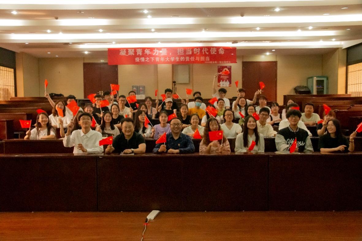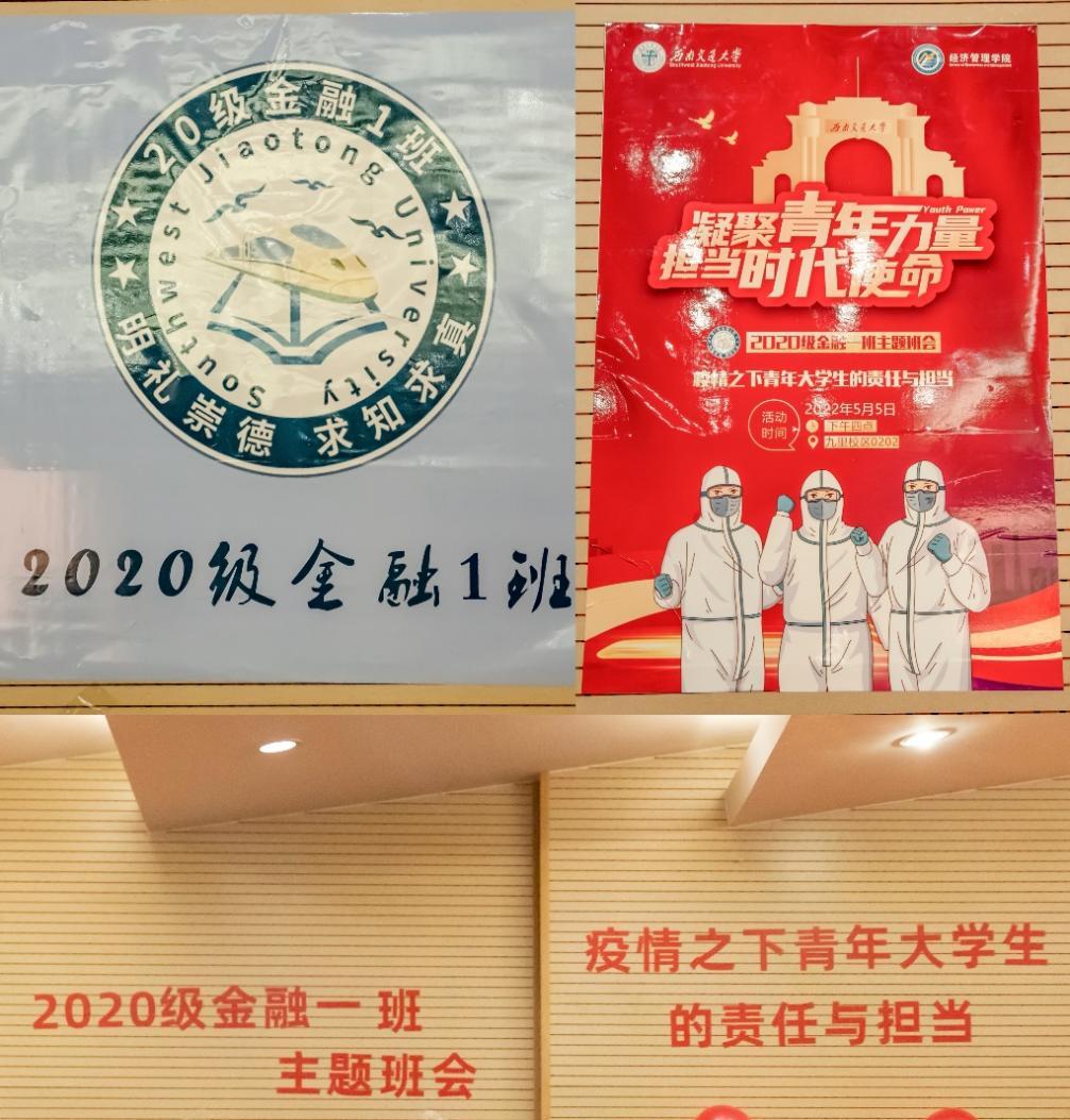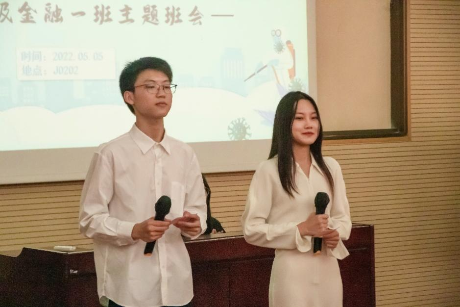 为深入贯彻党的教育方针,在班级内营造良好的班风学风,促进班级同学的全面成长,以实际行动践行新时代青年大学生的责任与担当,2022年5月5日下午4时在九里校区J0202教室,今年会本科2020级金融一班全班38名同学集体开展了“凝聚青年力量,担当时代使命——疫情之下青年大学生的责任与担当”主题班会。今年会党委副书记杨宏毅,今年会团委副书记、本科2020级辅导员陈建奇,本科2020级辅导员罗琴参加了此次班会。