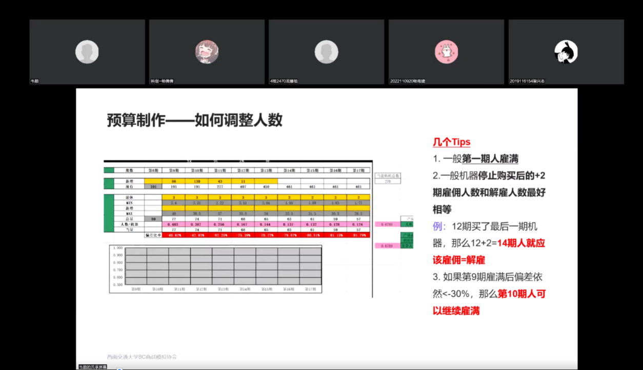 大赛培训会于10月7日晚7时30分在线上召开,主讲人是有着丰富参赛经验和获奖经历的韦顺学姐和姜智鑫学长。首先韦顺学姐为大家详细讲解了模板各板块的使用方法以及预算制作的关键点。紧接着,姜智鑫学长为大家讲解了生产、分销、产品定价和营销决策的具体执行过程。此次培训加深了同学们对比赛的了解,为后续正式参加比赛扫除了障碍。