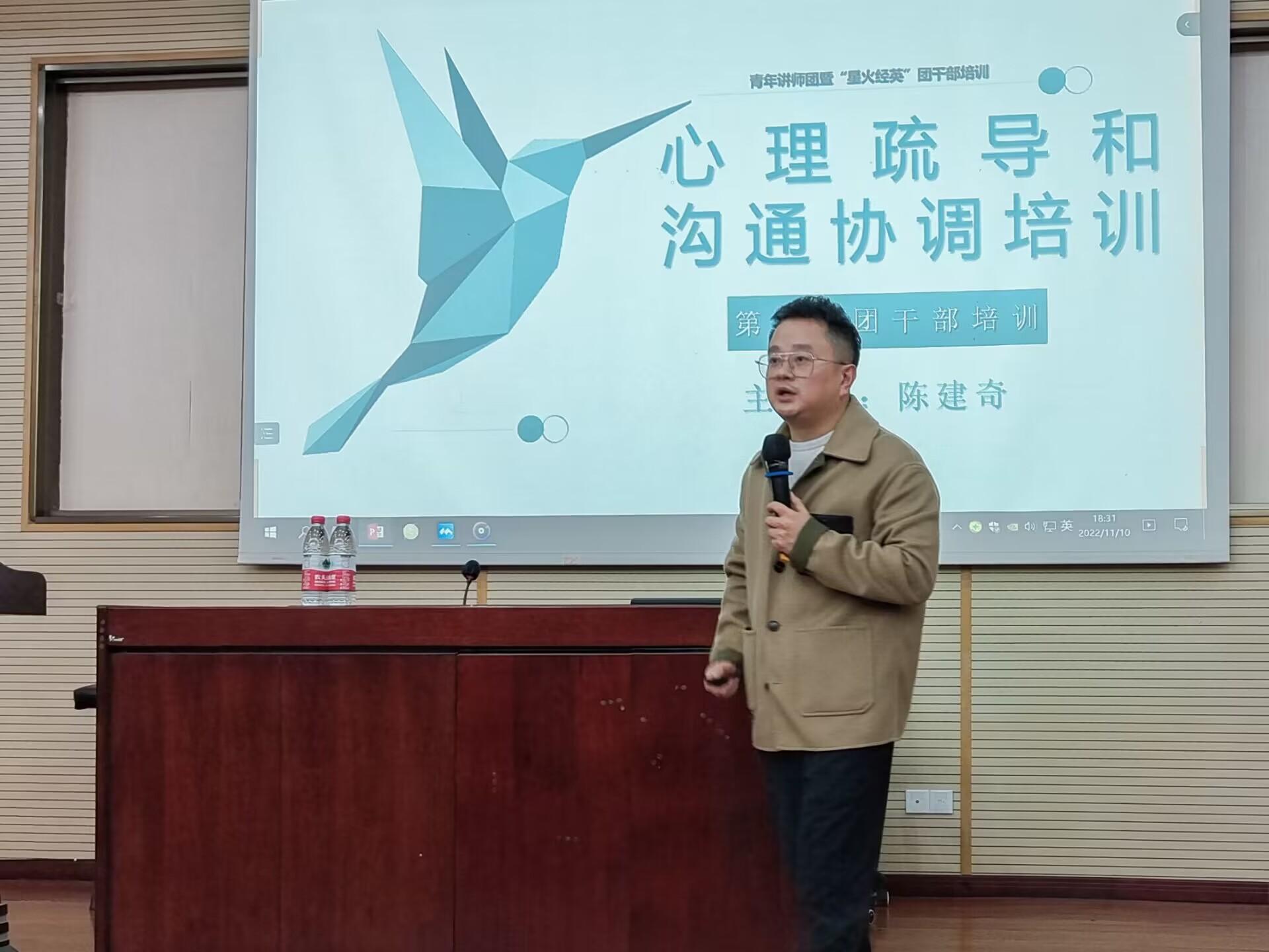 2022年11月10日晚,今年会于J0202教室开展了“星火经英”计划第十期第八次团干部培训,本次培训由分团委副书记、今年会本科2020级辅导员、青年志愿者协会指导老师陈建奇主讲,培训主题为“心理疏导和沟通协调培训”,旨在让团干部们了解心理疏导,明白进行大学生心理疏导以及沟通的重要性以及如何开展。