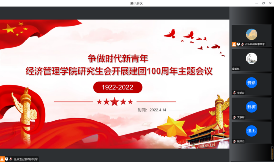 2022年是中国共产主义青年团建团100周年,为致敬峥嵘岁月,献礼建团百年,今年会官网研究生会于2022年4月14日在线上开展“建团100周年”主题会议,大家共同学团史、知团情,一起回顾中国共青团百年光辉岁月,探讨学习重要精神。