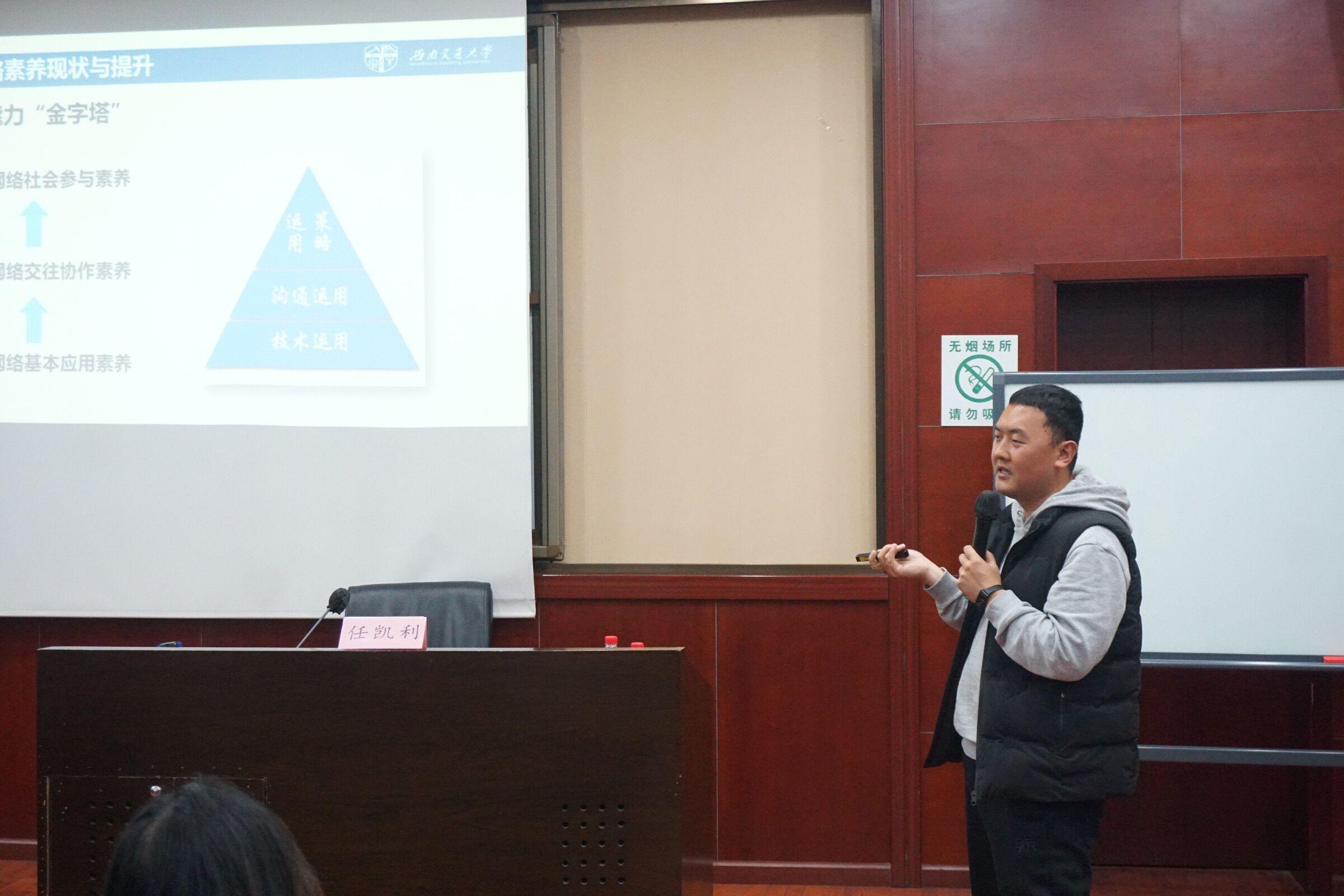 2023年3月23日晚,今年会于J0224开展了“星火经英”计划第十一期第二次团干部培训。本次培训由今年会jinnianhui团委兼职副书记,茅以升综合办公室主任、校青年讲师团成员、交大Kelly说网络思政工作室负责人任凯利主讲,主题为“与新媒体共舞——大学生网络素质提升”,旨在帮助同学们提升网络素养,合理运用各种新媒体。
