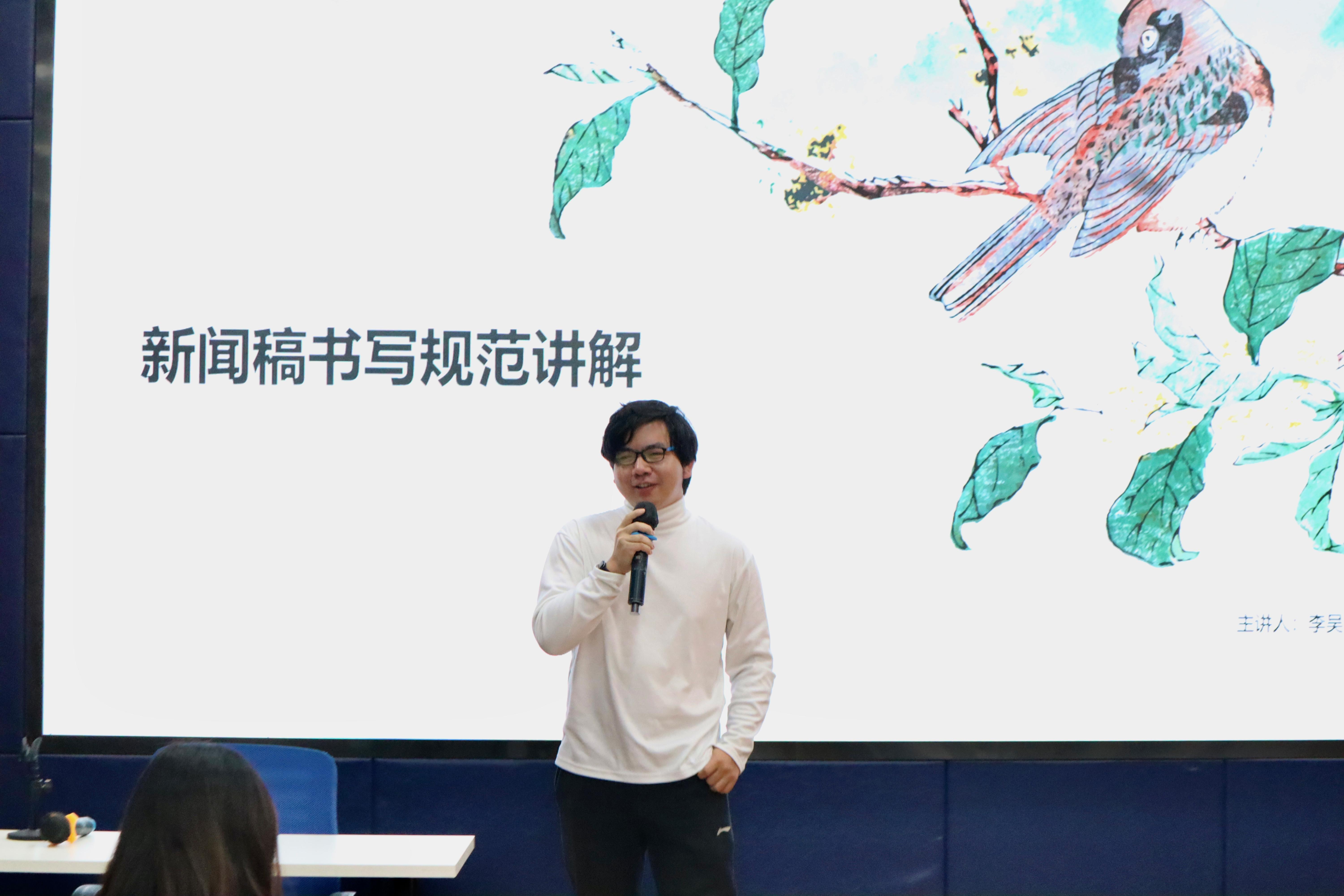 在第一环节,李吴傲向大家介绍新闻稿书写规范,包括撰写新闻稿的整体思路、叙述方式和新闻稿写作过程中的注意事项。李吴傲详细介绍了标题的要素和三段式新闻稿的写作方法,传授撰写思路,指出新闻稿中常出现的错误。同时通过案例分析,帮助同学们加深印象。