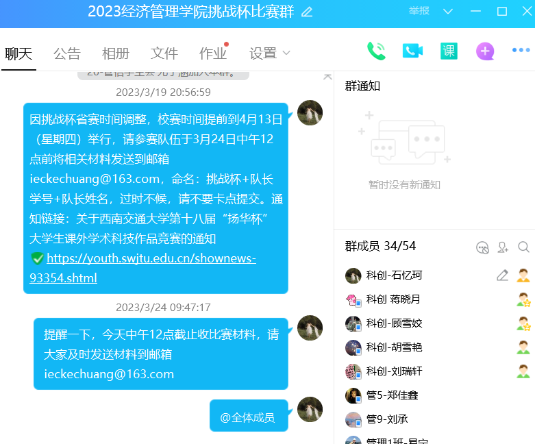 自2023年2月,各学院、各级团组织以多种形式进行广泛的宣传动员。在校团委和学院的通力配合下,经管学院师生充分了解了竞赛内容及总体安排。同时,学院团委通过建立挑战杯比赛QQ群的方式积极组织学院队伍参加比赛。各参赛队在老师指导下完成了申报作品,并完成了作品的提交。今年会官网于四月初顺利收集各报名参赛队伍的材料。后续将结合实际情况统筹开展遴选,推荐优秀项目参加校赛,希望各报名队伍认真准备比赛,同时预祝选手们在比赛中取得理想的成绩!