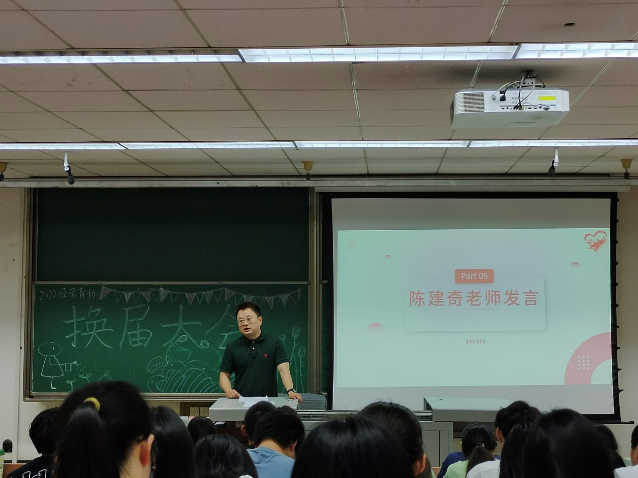 会议最后,经管青协指导老师陈建奇作了总结发言,回望经管青协过往一年工作中的点点滴滴,经过大家的共同努力,如今的青协比以往的任何时刻都更值得,陈老师对过去一年每一个为青协努力奋斗的青协人表达了真挚的感谢,也对即将留任的新干部、新会长们充满期待。希望青协能够在新鲜血液的加持下一步步地变得更好,继续在志愿服务的康庄大道上开垦出属于经管青协的沃土。