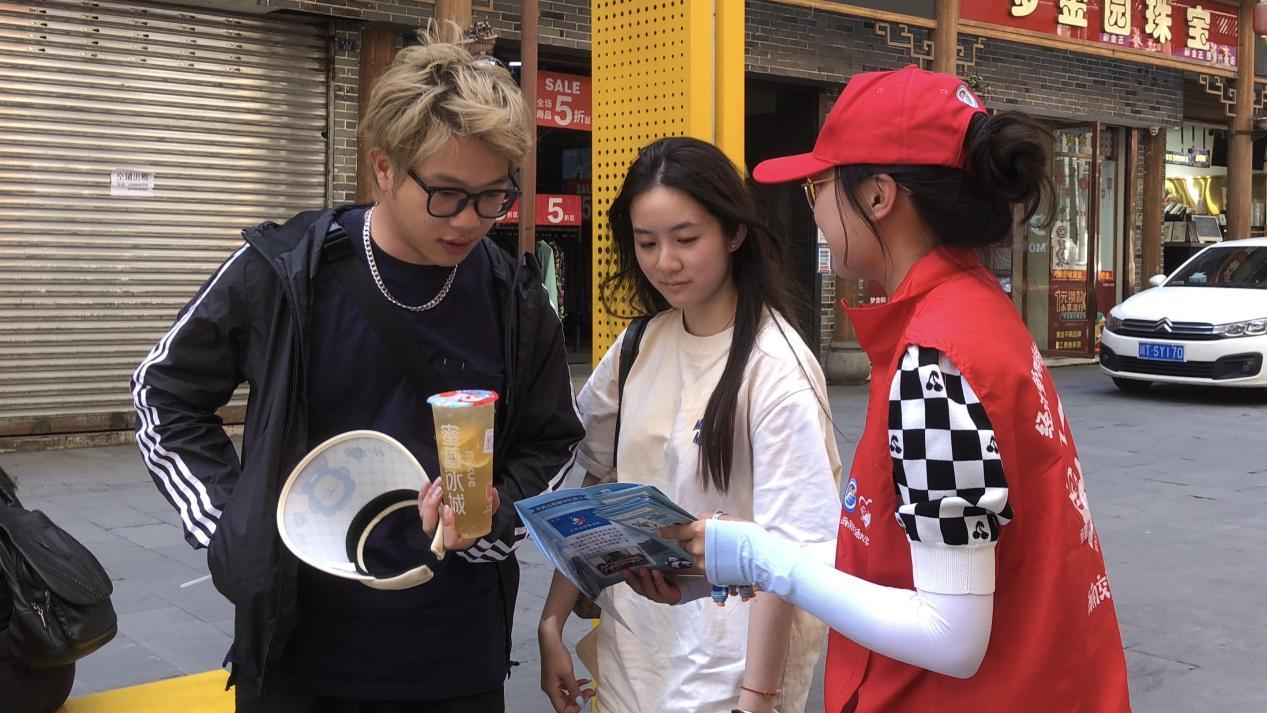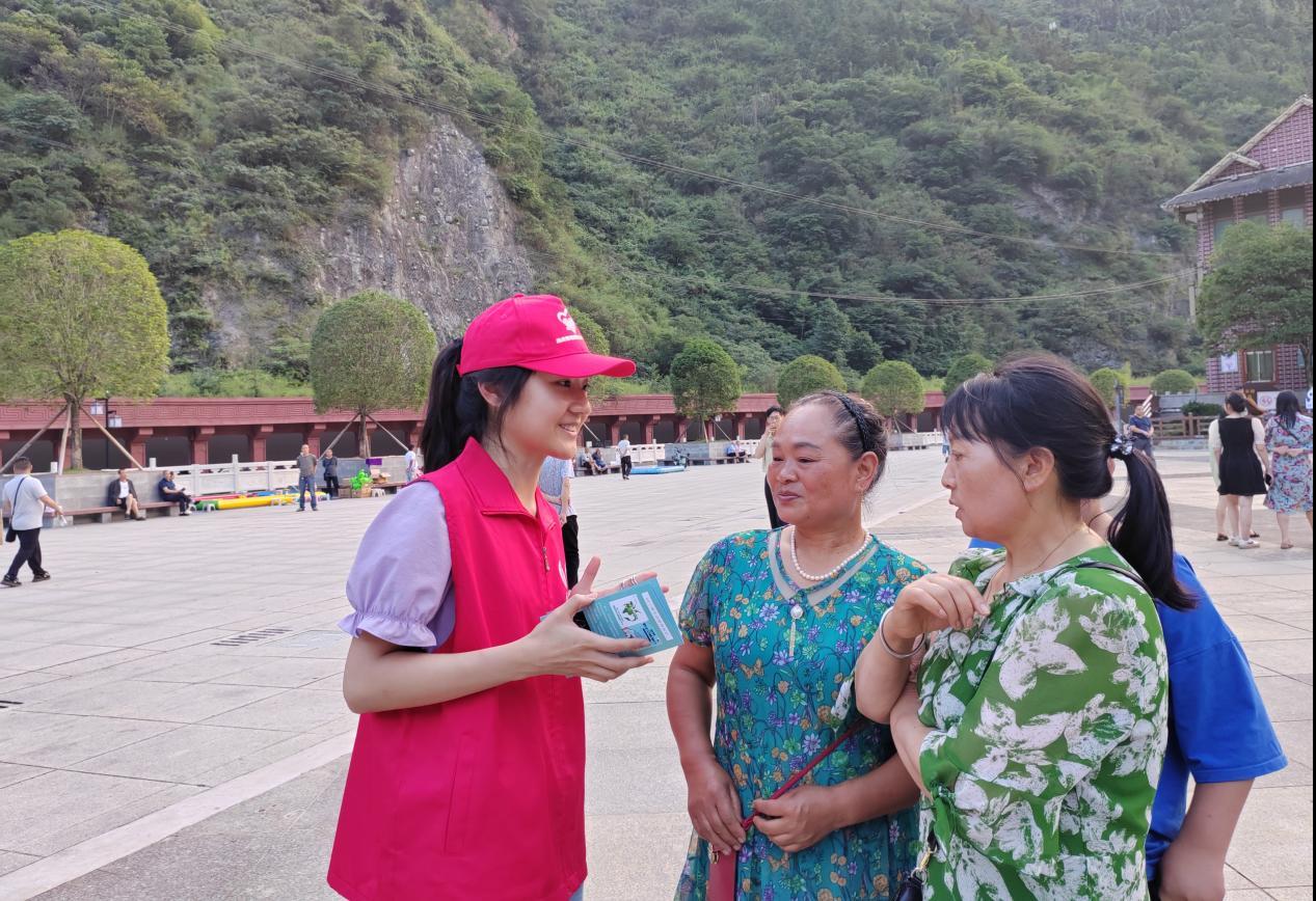 随后,在与景区负责人对接后,团队成员在红军广场布置了宣传摊位。红军广场位于景区内夹金山下,是红军长征的历史见证,也是居民休闲活动的场所。当地居民对团队的到来表示欢迎,并纷纷向队员们讲述了自己对大熊猫文化、红军文化的了解。言谈之间,队员们对这座兼收并蓄的文化之城有了更加深刻的理解。