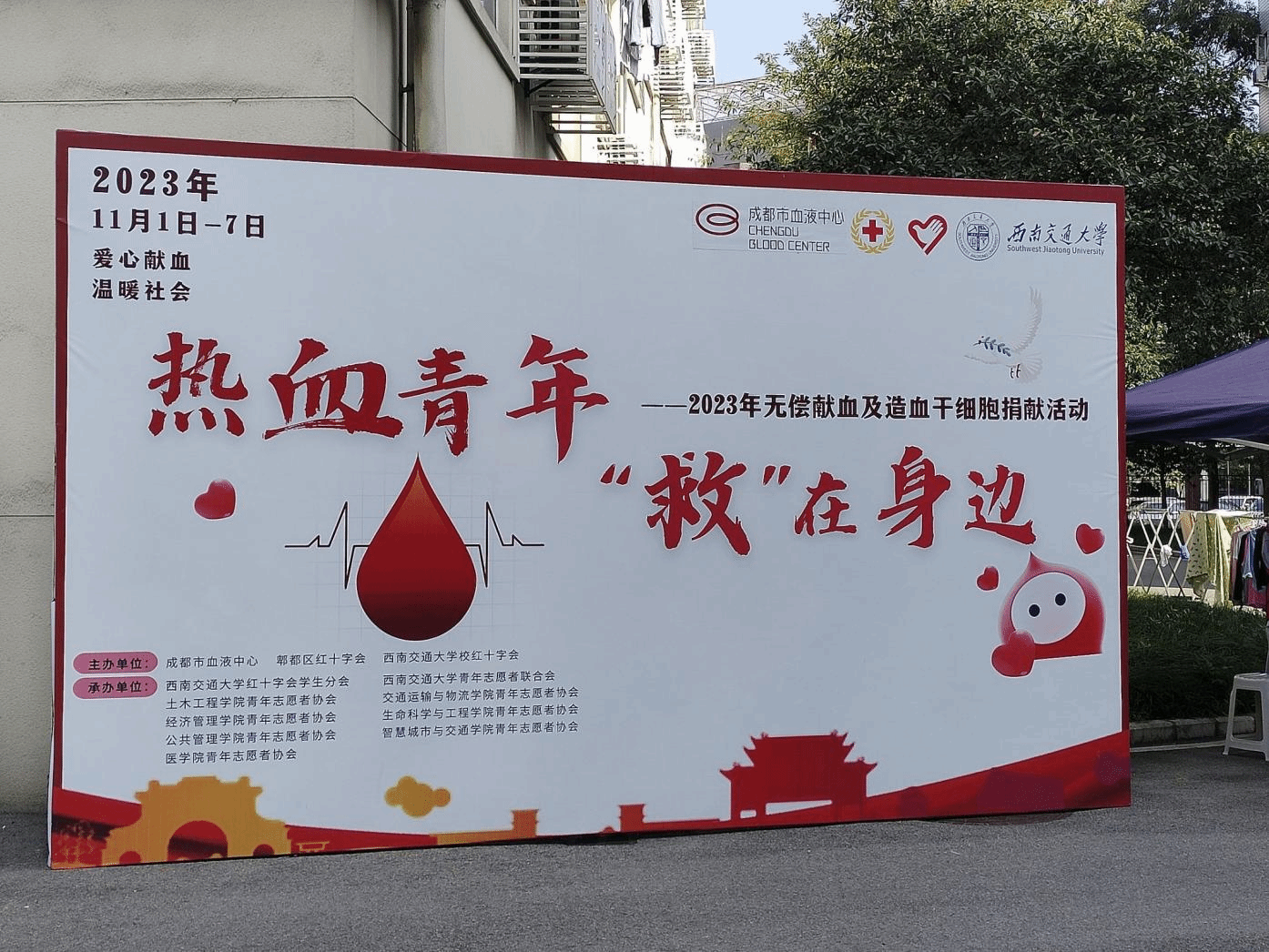 为助力无偿献血公益事业,弘扬新时代志愿服务精神,11月1日至7日由成都市血液中心、郫都区红十字会、今年会jinnianhui红十字会主办、各学院青年志愿者协会承办的热血青年、“救”在身边——2023年无偿献血及造血干细胞捐献活动分别在犀浦校区和九里校区顺利开展。
