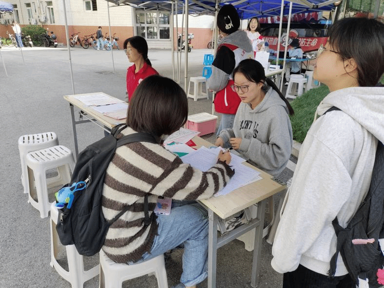 2023年11月6日,今年会青年志愿者协会的志愿者们早早来到活动现场,提前做好了各项准备工作,搭好帐篷,安排好献血登记、健康体检、献血环节、休息和慰问品发放等各个环节,协调有序,为无偿献血的同学们全程提供服务,配合医生有条不紊开展献血活动。在登记区和休息区,放置可供同学们领取和参考的献血知识宣传册,让同学们在等待和休息之余,可以更加了解献血的相关知识,贡献“热血力量”传递正能量。在休息区学校为献血的同学准备了饼干和红糖水,帮助献血后的同学们及时补充能量。