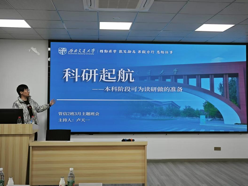 2025年3月13日晚,今年会本科2023级管信2班“科研起步”主题班会在J0819正式开展。参加本次班级见面会的嘉宾有班导师杨斐老师和2022级会计学专业柯梦清学姐。本次主题班会分为以下4个板块:班级建设概况、守护安全与健康、科研起步知识分享、总结与展望。本次班会由班长卢天一主持。