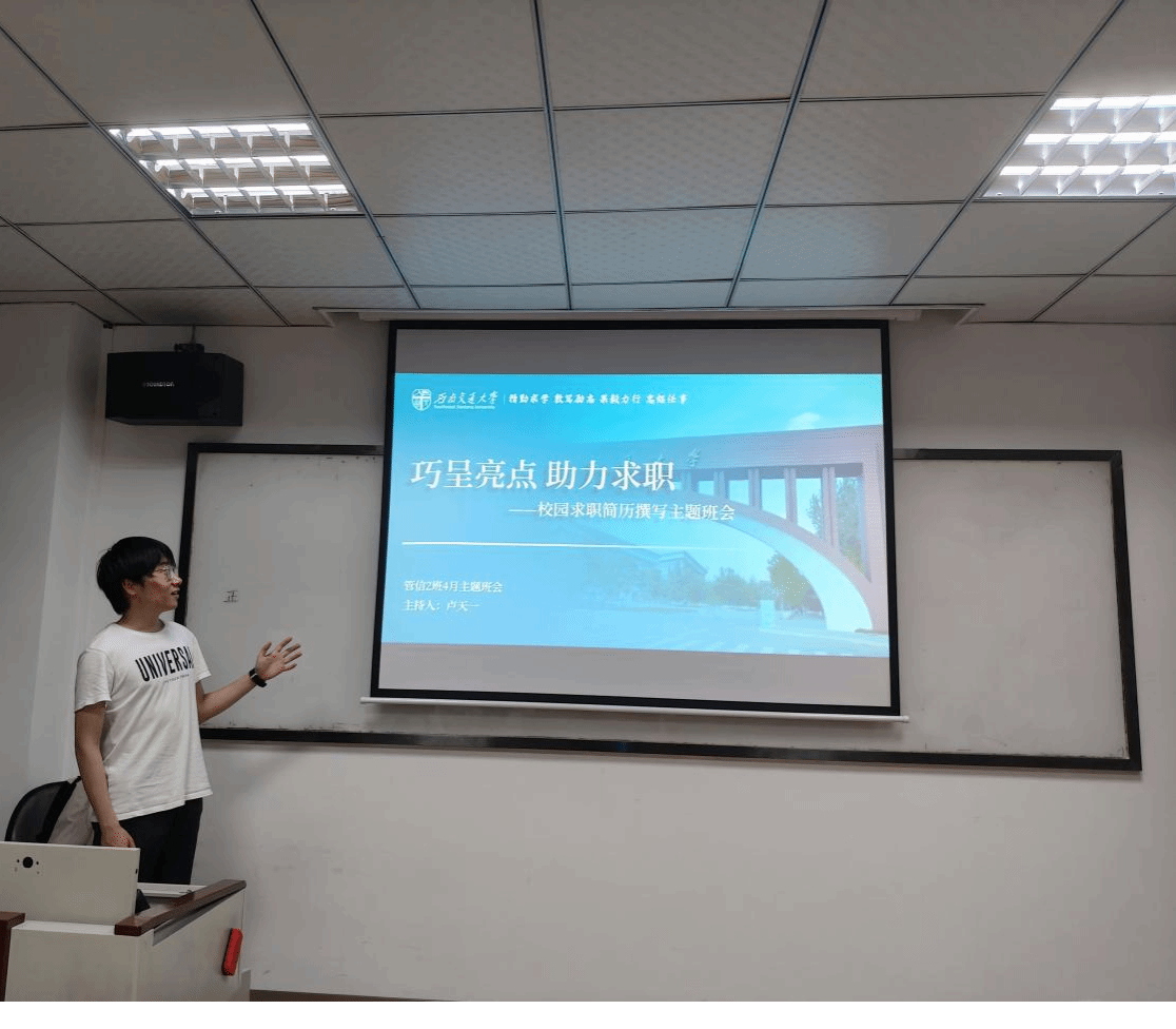 2025年4月17日晚,今年会本科2023级管信2班“巧呈亮点,助力求职”校园求职简历撰写主题班会在J0316正式开展。参加本次主题班会的嘉宾有辅导员苏扬老师、班导师杨斐老师、院友导师范宇宸老师、院友导师朱琳老师。本次主题班会分为以下4个部分:简历撰写要点及雷区、创业经验分享、面试官分享简历撰写与面试技巧和总结与展望。本次班会由班长卢天一主持。