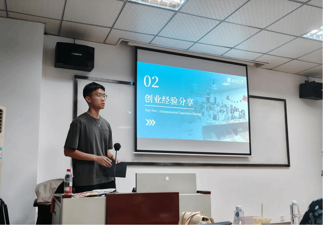 在第二部分创业经验分享环节中,班级的创业者尤钰文同学分享了自己的创业故事。他讲述了自己从找兼职到招兼职的转变历程,畅谈创业过程中的思考与感悟。他热情鼓励同学们勇敢探索更加多元的自我,为未来发展奠定坚实基础。