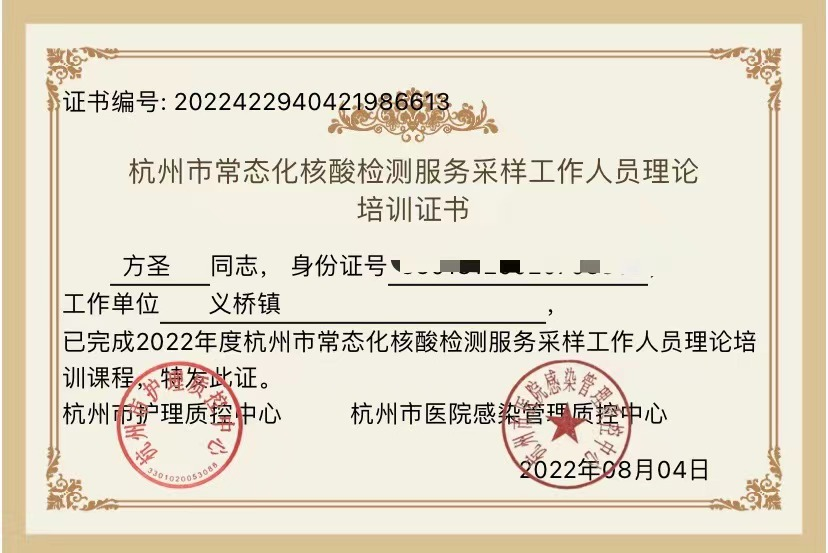 党支部预备党员方圣同志主动请缨,参与到浙江省杭州市萧山区义桥镇防疫办组织的常态化核酸检测工作当中,主动接受培训学习,用行动展现党员的先锋模范带头作用,展现青年人的责任与担当。