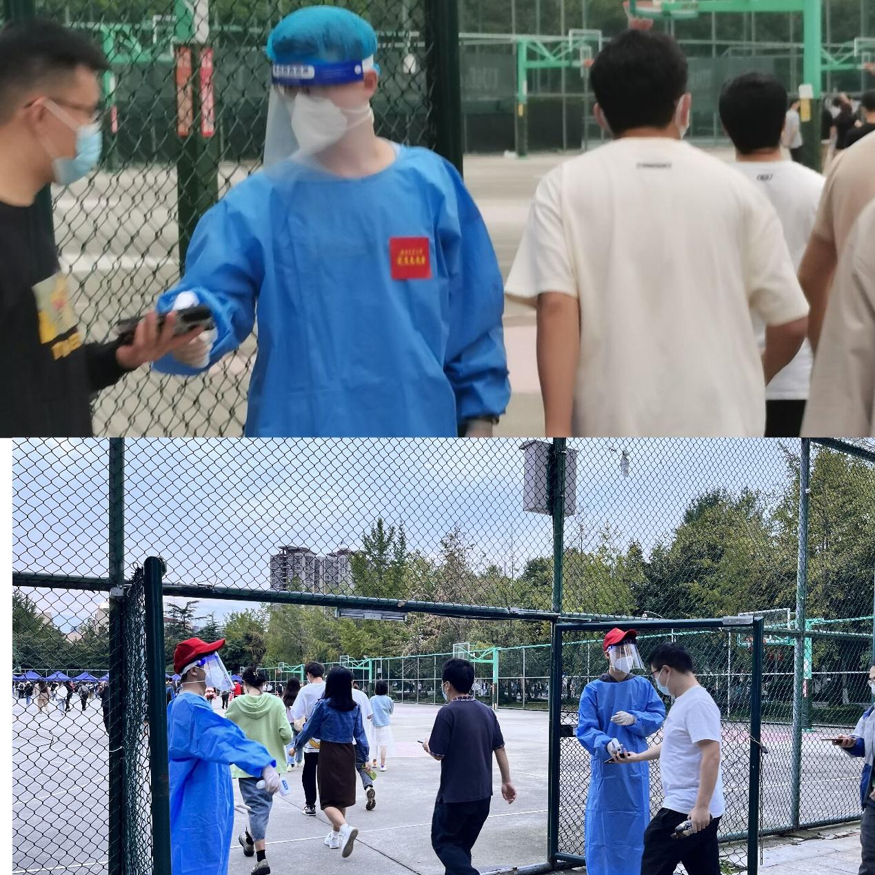 扫码、录入信息、协助医务工作者完成核酸检测,这是党支部党员陈建奇、尹玉萌同志在今年会jinnianhui九里校区的抗疫日常。穿上防护服、打开手机便开始了一天的工作,冗长的核酸队伍,无法停歇的重复扫码,汗水浸湿了衣服,但是,一句“感谢”带来的心满意足和盼望疫情早日消散、重现烟火交大的信念让他们认认真真、毫无怨言。
