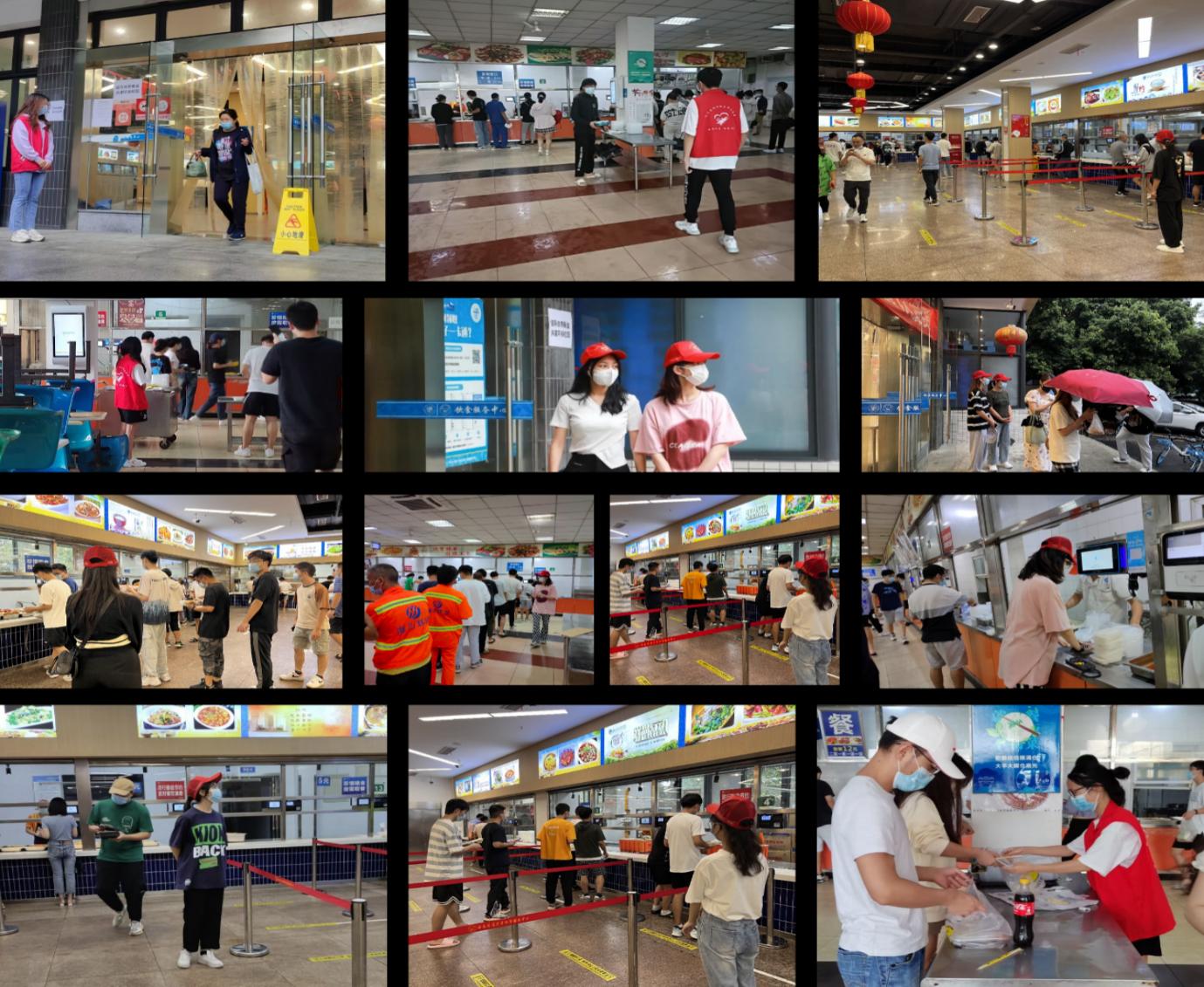 提醒核酸检测队伍保持间距、引导同学们有序就餐 |