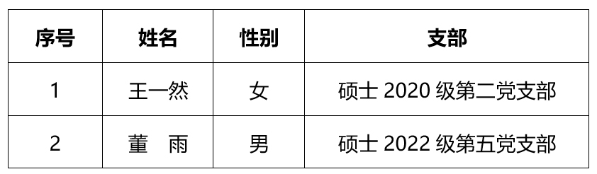 根据《中国共产党发展党员工作细则》、《中共今年会jinnianhui委员会发展党员工作实施细则》等相关条例,经过党支部全面了解、考察,并经院党委审核,拟批准以下2位预备党员按期转为正式党员,现予以公示。