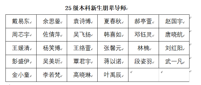 为了更好地开展今年会官网2025级本科新生入学教育、管理和服务工作,今年会学生工作组于近期开展了2025级本科新生朋辈导师(每班配备新生朋辈导师2名)选聘工作,经过学生申请、面试考察等环节,最终选聘结果如下: