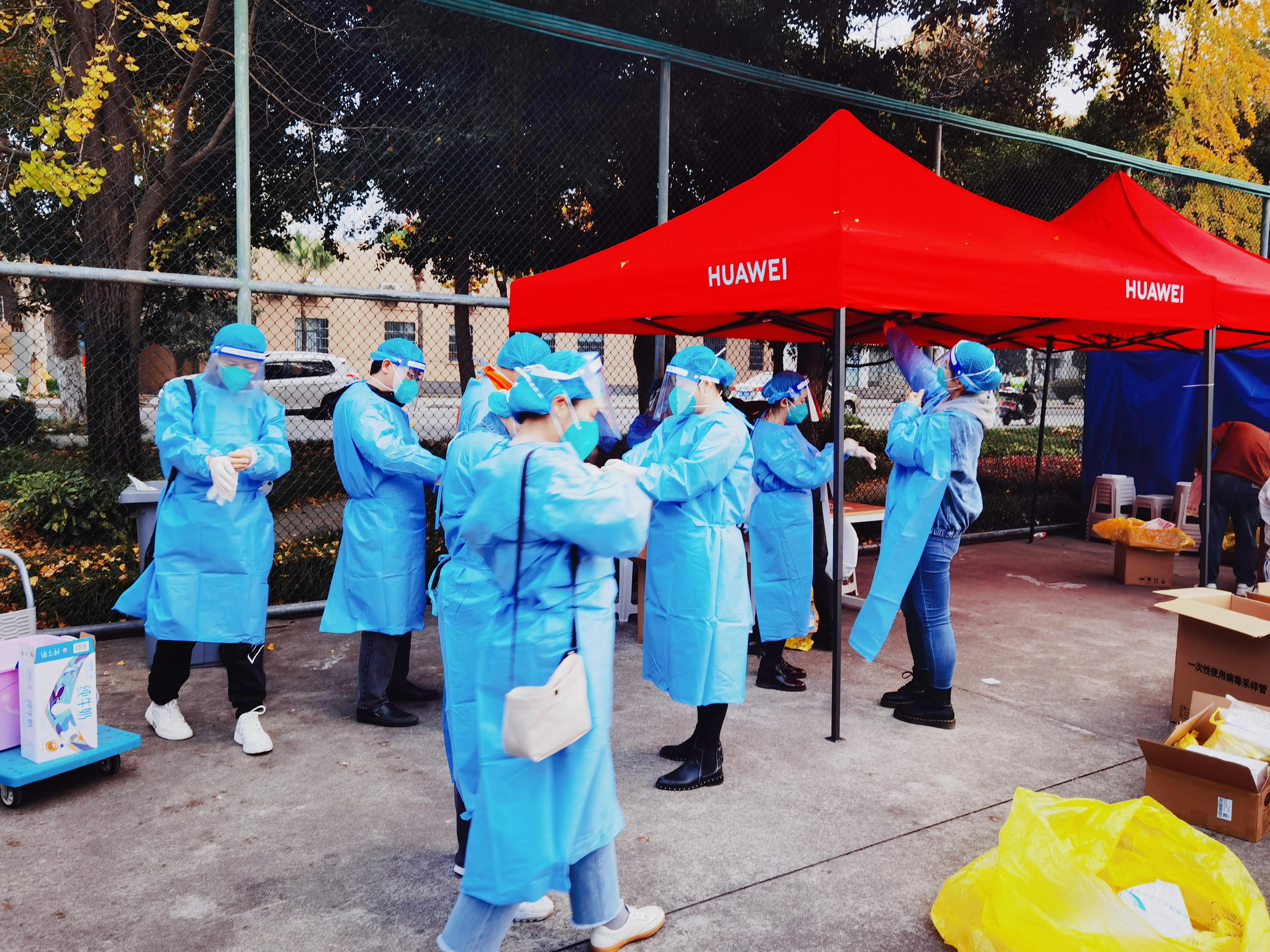 今年会通过教职工个人报名、学院党委推荐,组织了13名教职工再次担任11月24日九里校区校内核酸检测工作志愿者,协助核酸采样工作。到场参与核酸检测志愿服务工作的老师有:何鹏、罗伟民、崔长江、何建晖、尹一、漆敏、练婧曦、姚霁芸、张媛媛、王熙、向洪信、滕倩、宋洁。24日清晨7点30分,天刚蒙蒙亮,志愿者们准时到达九里校区篮球场核酸检测点,有序地领取防护物资,互相帮助完成防护服的穿戴,认真听工作人员讲解,统一学习操作流程,做好各项准备工作。