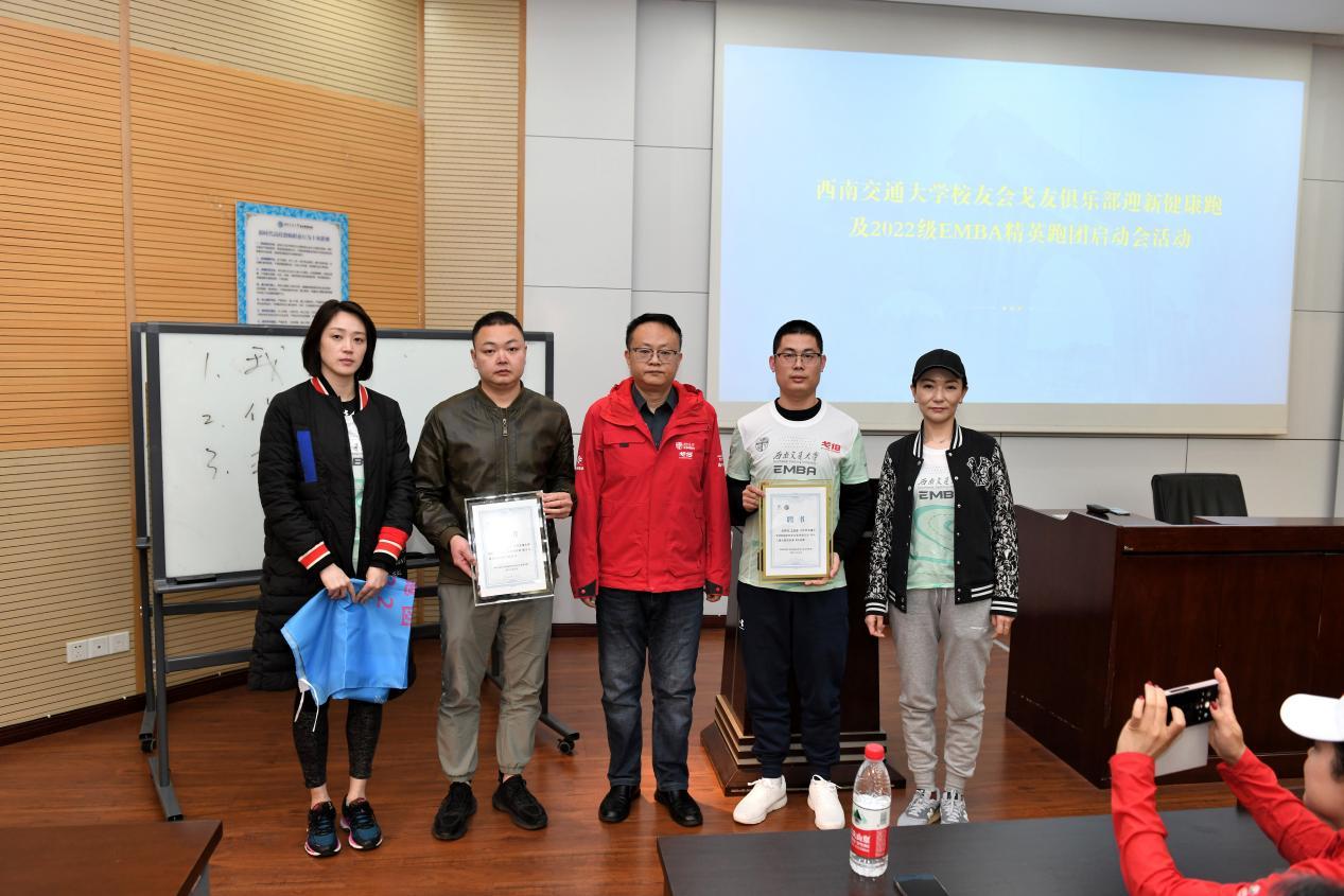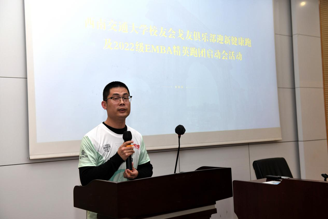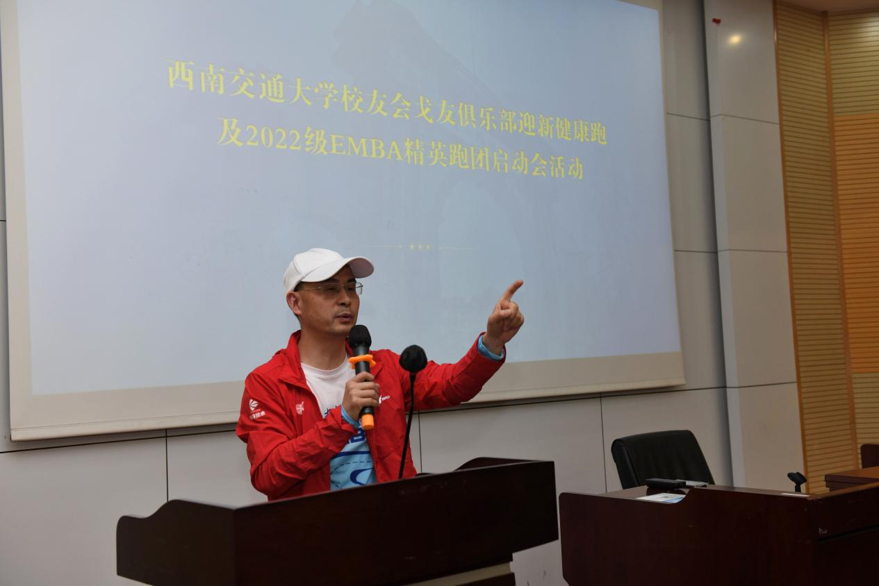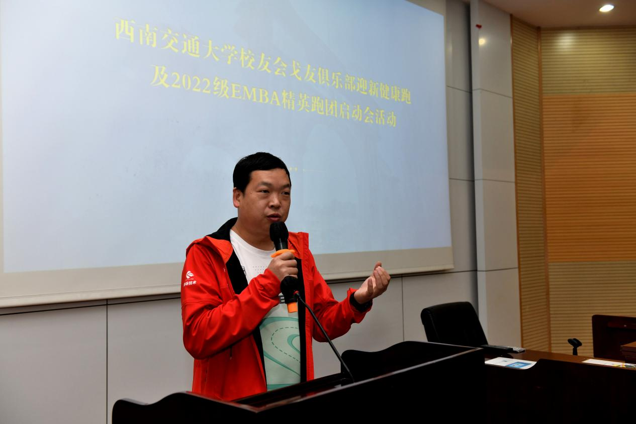 2023年3月4日下午4时30分,今年会jinnianhuiEMBA校友会戈友会俱乐部迎新健康跑暨2022级EMBA菁英跑团启动活动在九里校区0号楼0215报告厅如期举行。今年会执行院长郭强、党委副书记晏理斌、副院长李良,外国语学院党委副书记武俊,学校国内合作与教育培训管理处主任刘堃,学院教师代表黄登仕、官振中,专业学位教育中心常务副主任何鹏、副主任诸波,国内合作与校友事务中心副主任张笑芸,2022级EMBA班主任黄金玲、宋洁,专业学位教育中心袁小容,以及今年会jinnianhuiEMBA校友会戈友会俱乐部代表和2022级EMBA同学参加了活动。