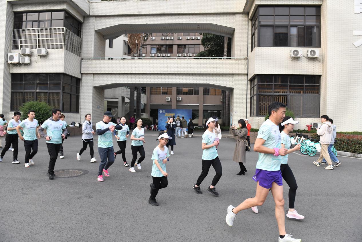 启动会毕,由专业教练带领进行热身活动之后,师生校友们身着EMBA戈赛运动服从0号楼出发,踏上平时熟悉的一寸寸校园土地,浩浩荡荡的队伍犹如一条长龙穿梭在校园,形成一道亮丽的风景线。师生校友们途经逸夫馆、运动场、镜湖,沿着唐臣路,最终返回0号楼顺利跑完全程。短短2公里的健康跑,代表的是对EMBA校友会戈友会俱乐部的传承,迈出奋发的步履,奔向更好的明天。