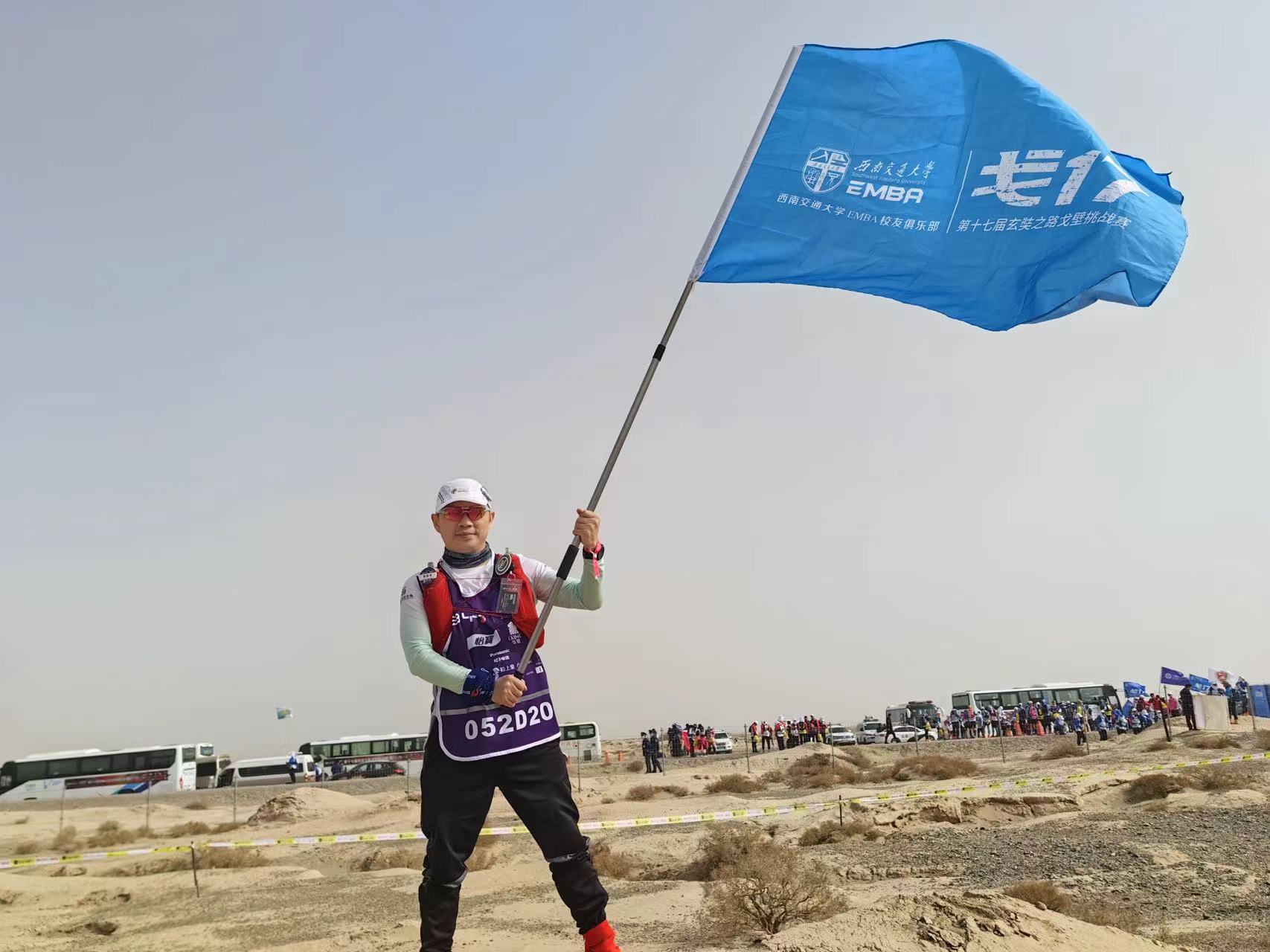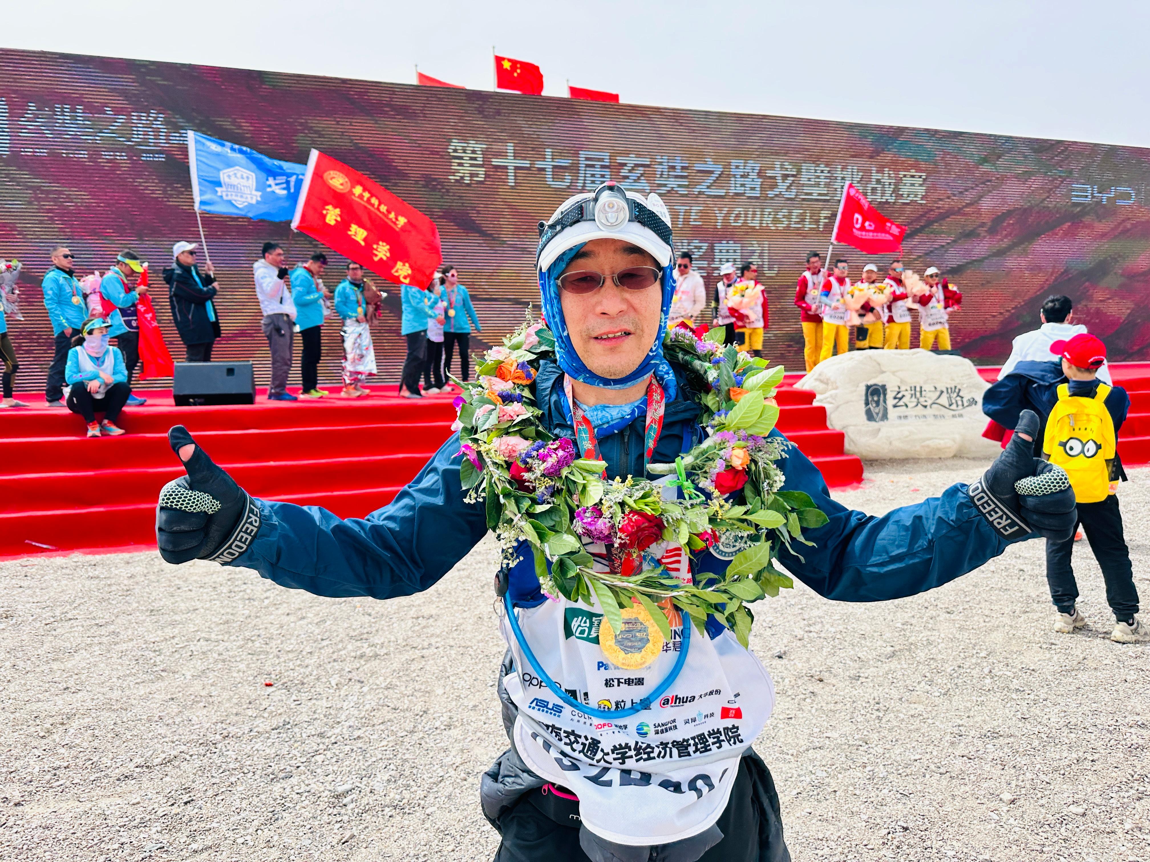 戈赛A+组是玄奘之路戈壁挑战赛最难的组别,选手需在22小时内跑完其他选手在四天三夜内完成的121公里路程,全程需要自补给、自导航,日夜兼程。今年的戈赛,天气异常突变和恶劣,昼夜温差大,风沙肆虐到一度熔断A+的赛程,完赛率只有36%。拓守盛校友以超人的意志力只用了16小时完成比赛。他身披学院旗帜冲过终点时,全场响彻起最激动人心的欢呼声,“今年会jinnianhui”这几个字也第一次打在戈壁挑战赛舞台的冠军榜上!