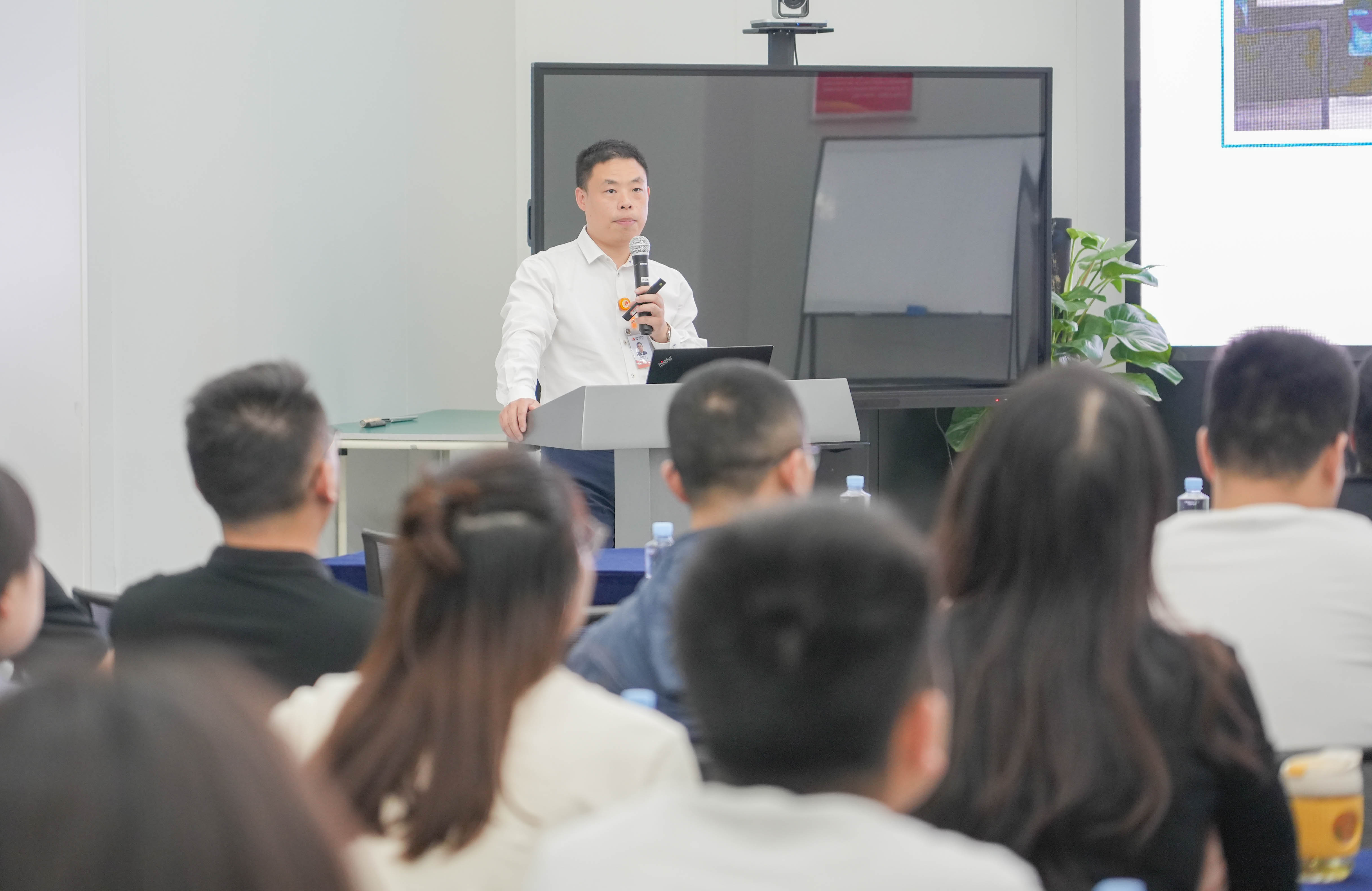 2022级MBA周末四班副班长吴中才作为企业生产管理者,向师生系统讲解了通威太阳能公司的智能制造及管理方式,同时现场与老师同学们针对设备自动化、仪器国产化率、企业科技投入、自动化人力成本、市场竞争状况等多方面的话题进行了深入交流探讨。