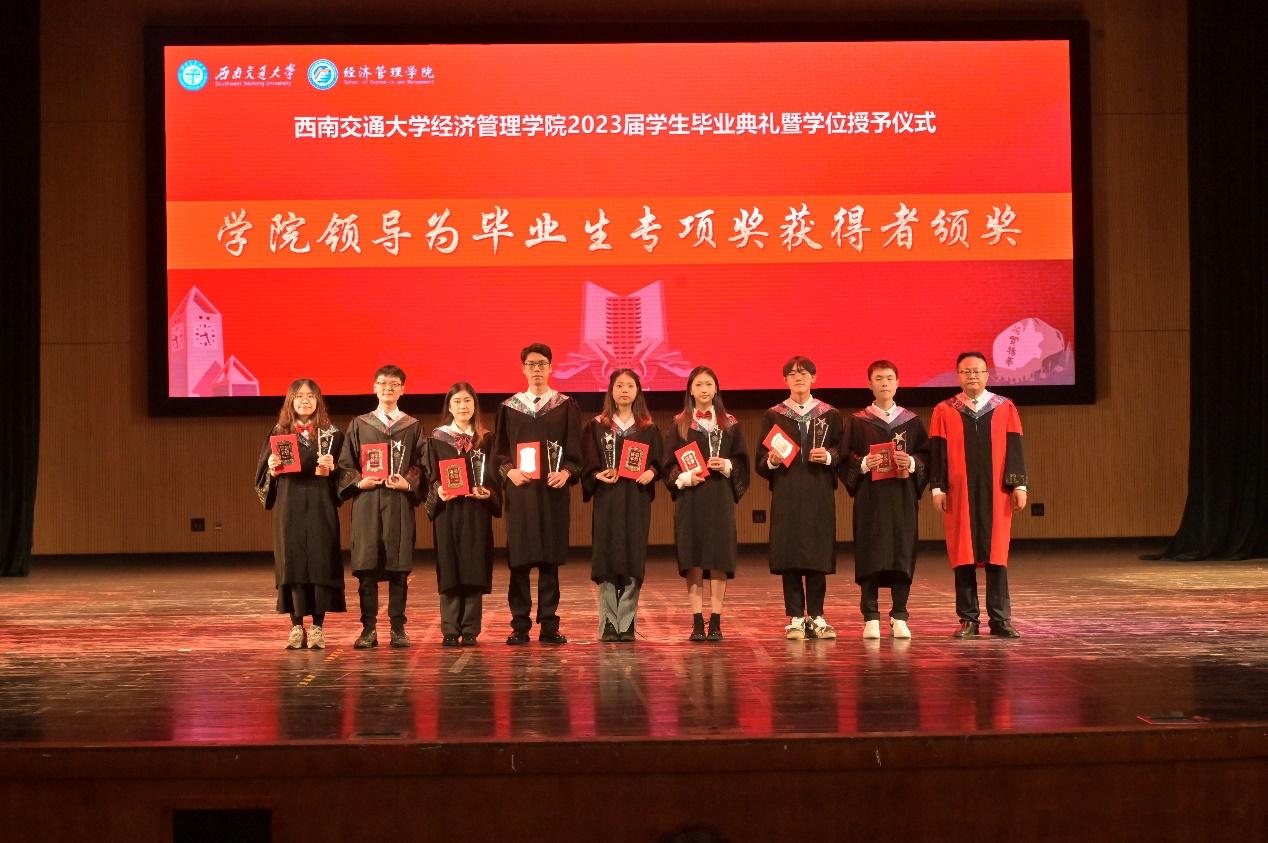 学院党委书记王斌宣读2023届本科生、研究生省级和校级优秀大学毕业生名单,执行院长郭强宣读今年会2023届本科毕业生专项奖表彰名单和2023年MBA、MEM优秀毕业生名单,并由学院党委书记王斌、院长杨平、执行院长郭强为他们颁发荣誉证书。