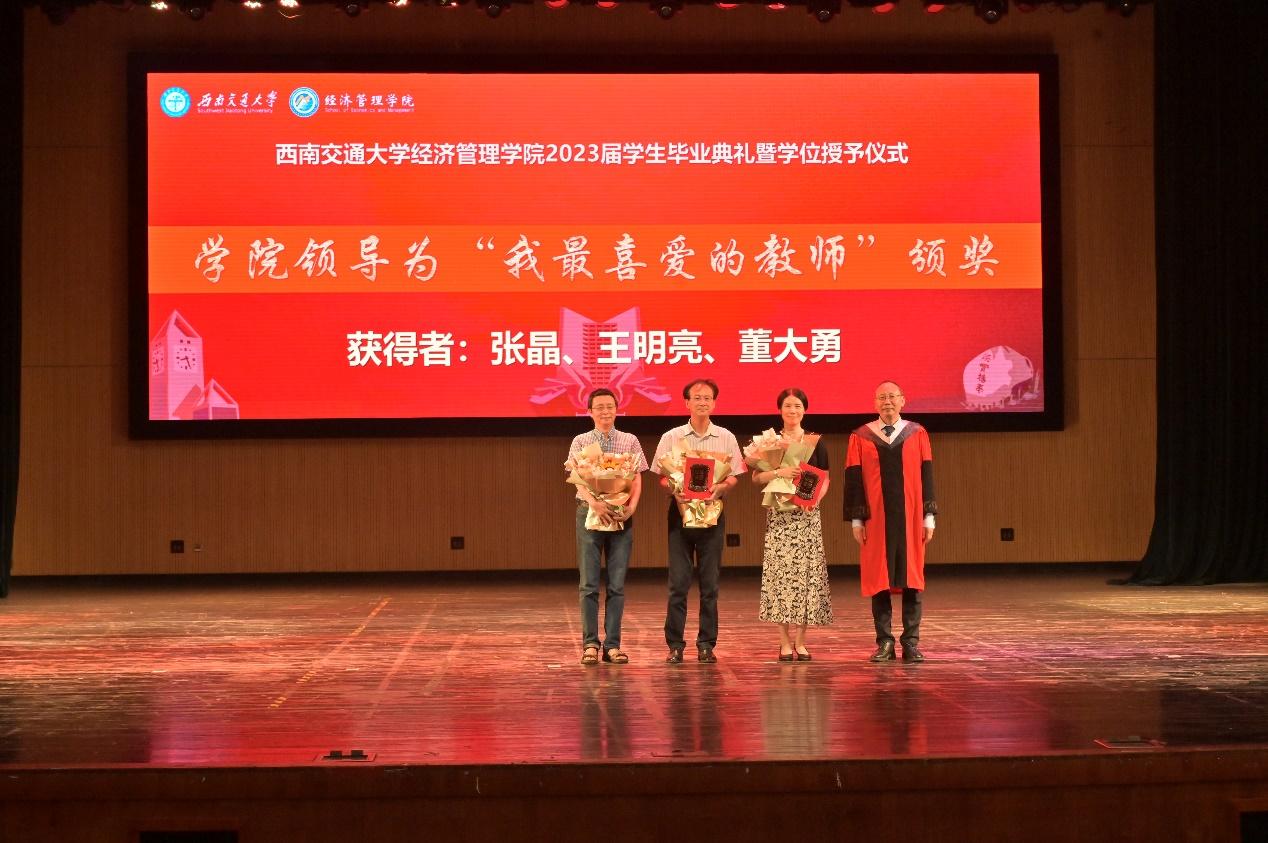 学院副院长李良宣读今年会官网2023届本科毕业生评选的“我最喜爱的教师”名单,获得者是:张晶老师、王明亮老师、董大勇老师,并由王明亮老师作为教师代表为2023届毕业生致临别寄语。他在发言中,回顾了与同学们共同走过的39年风风雨雨,分享了陪伴同学们成长的点点滴滴,希望同学们在将来仍要积极努力,一定要做一个对社会、对集体、对家庭有责任感的人,彰显我们交大经管新青年的大格局、大情怀、大担当。
