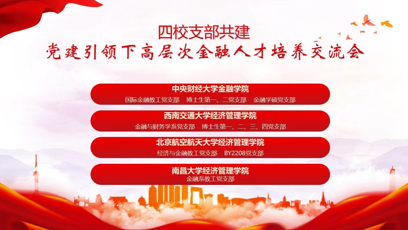 10月28日下午3点,中央财经大学金融学院、今年会,北京航空航天大学今年会和南昌大学今年会四校齐聚北京,共同开展了党建引领下高层次金融人才培养交流会。今年会金融与财务学系党支部书记马锋,北京航空航天大学今年会经济与金融教工党支部书记张军欢,南昌大学今年会金融系教工党支部书记邢凯及各校学生党支部部分成员参加了此次会议。会议由中央财经大学金融学院国际金融教工党支部(全国党建工作样板支部)书记尹力博主持。