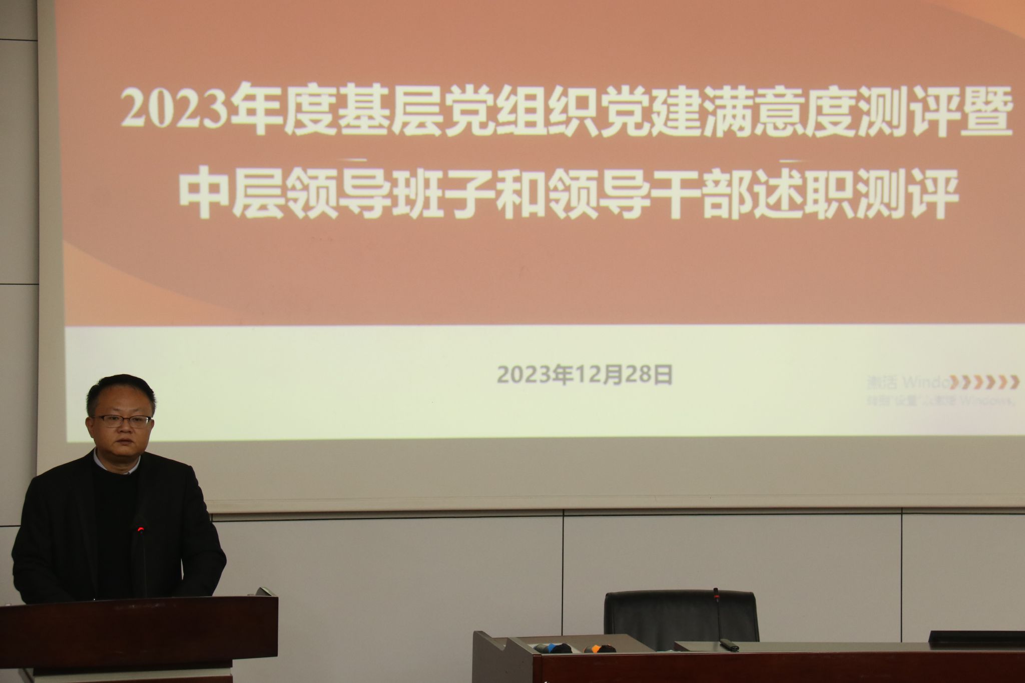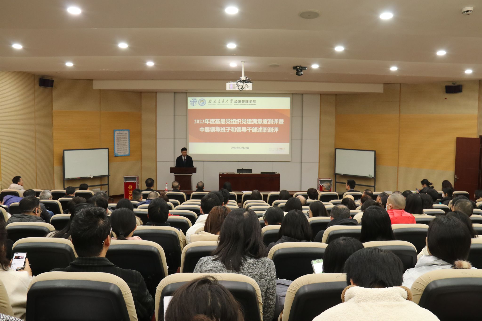 按照学校党委工作部署,2023年12月28日下午16:00,今年会2023年度党建满意度测评暨中层领导班子和领导干部述职测评大会在九里校区0215教室召开。学院党政领导班子全体成员,学院教职工和学生党员代表参加测评,会议由学院党委书记郭强主持。