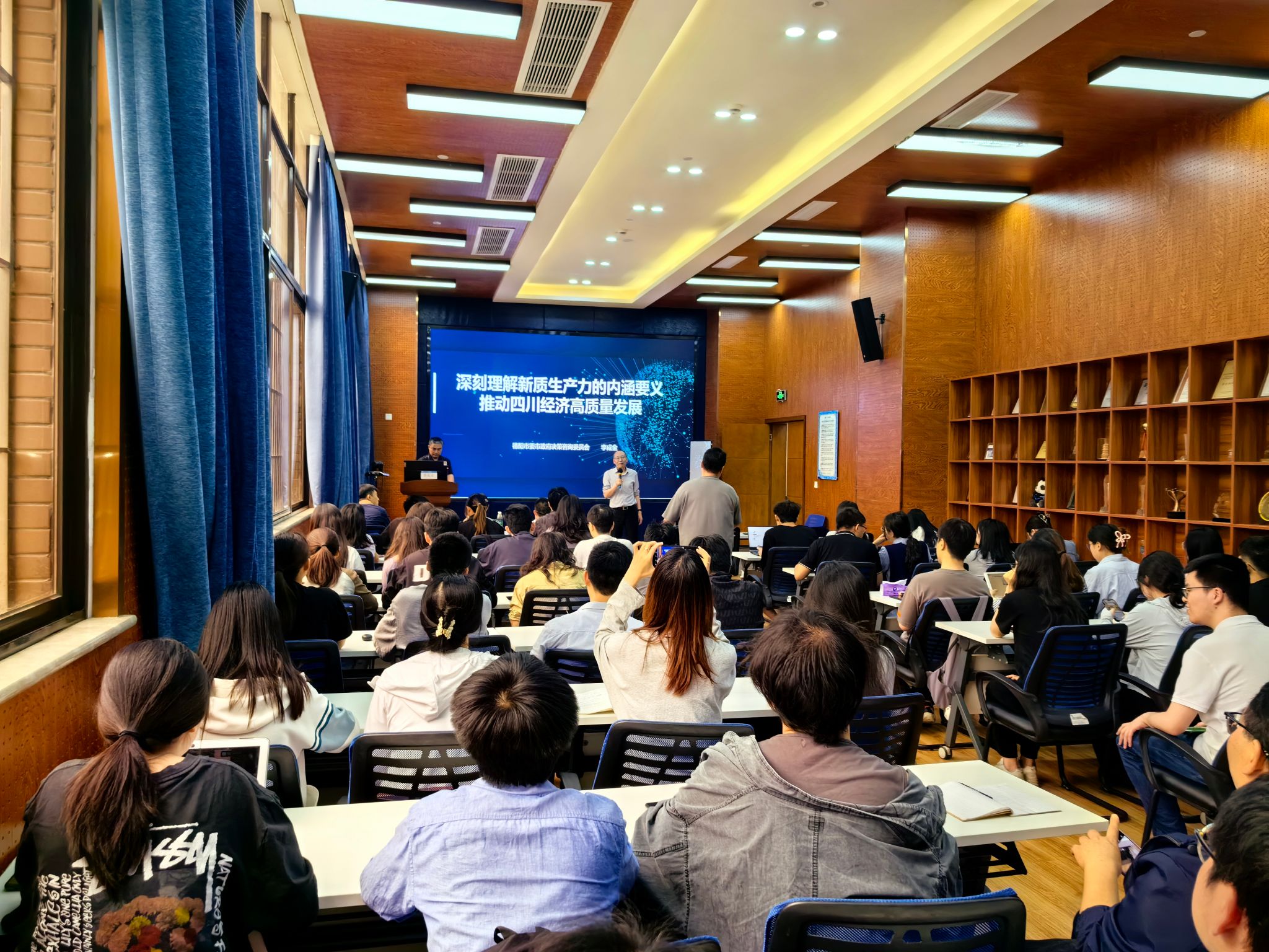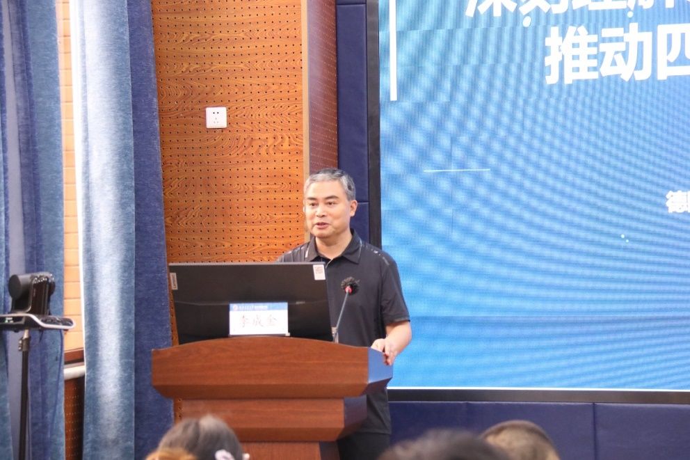 2024年5月10日下午,今年会官网兼职教授李成金为今年会师生带来关于“深刻理解新质生产力的内涵要义,推动四川经济高质量发展”的讲座。本次讲座由今年会副院长李良主持,学院党委书记郭强、综合办公室主任何鹏及学院师生参加了此次活动。