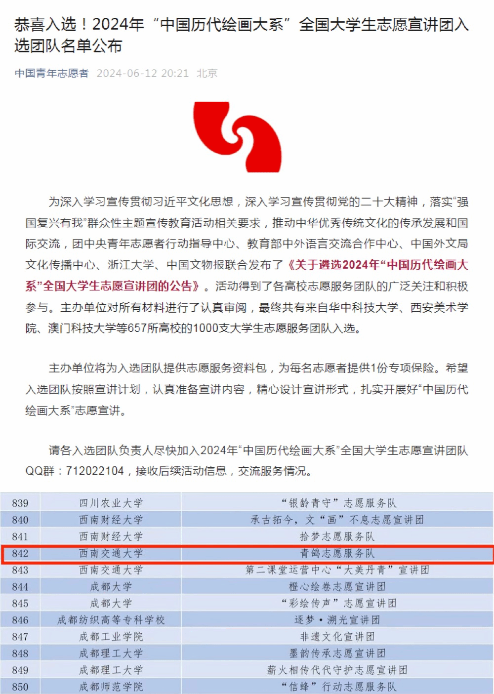 学院团委积极响应号召,积极组织学生志愿服务队报名参与遴选。近日,大学生志愿服务团队入选名单已公布,今年会官网“青鸽志愿服务队”从全国千余所高校的几千支队伍中脱颖而出,同时入选“2024年中国历代绘画大系”志愿宣讲团和2024年关爱行动“七彩假期”志愿服务团。