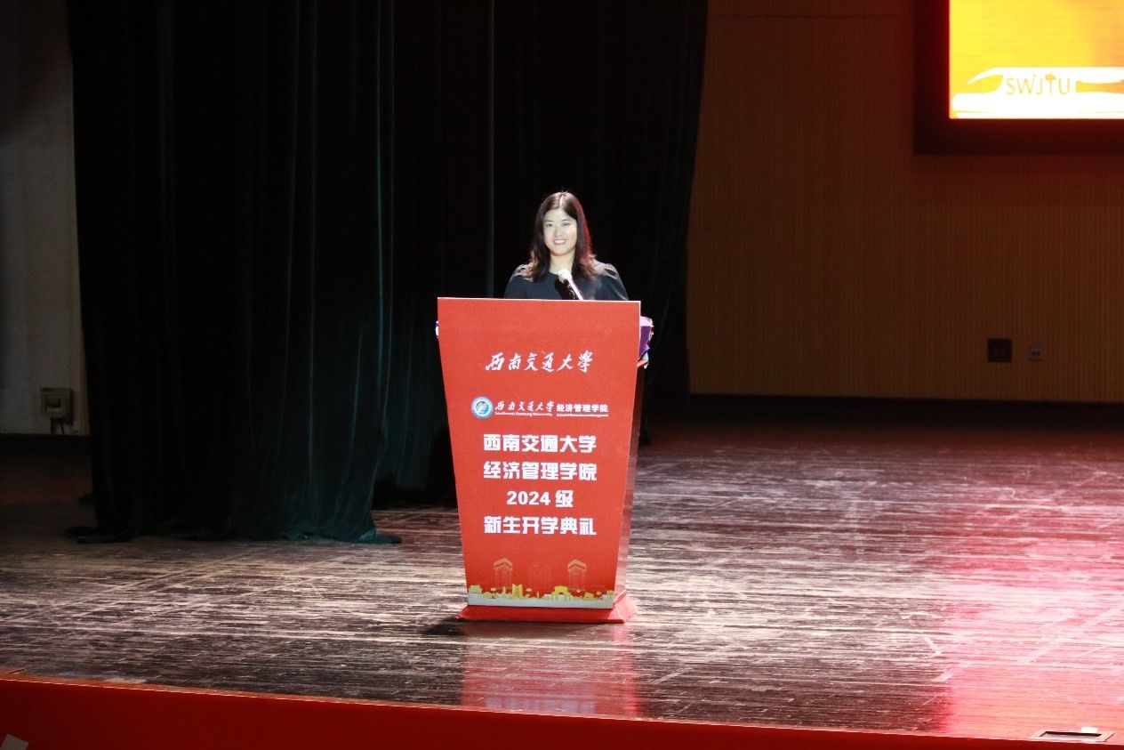 议程五,研究生新生代表王灵瑶发言。她首先向朝夕相处的师长和前辈表示衷心的感谢,给予出席开学典礼的同学们真诚祝贺。回忆起求学路上的点点滴滴,她总结到以下三点:第一,脚踏实地,汲取前行力量。在本科四年里,她于专业知识、科研活动、学科竞赛等多方面均衡发力并取得优异成绩,探索未知,收获学问;第二,究其真理,反躬以践其实。在美的集团参与暑期实习项目,亲手解决商业问题,她深深体会到了学以致用、知行合一的真谛;第三,开放心态,拓宽国际视野。她深感自豪交大经管学院在国际上取得的突破,希望吾辈不负培养,奋发图强。