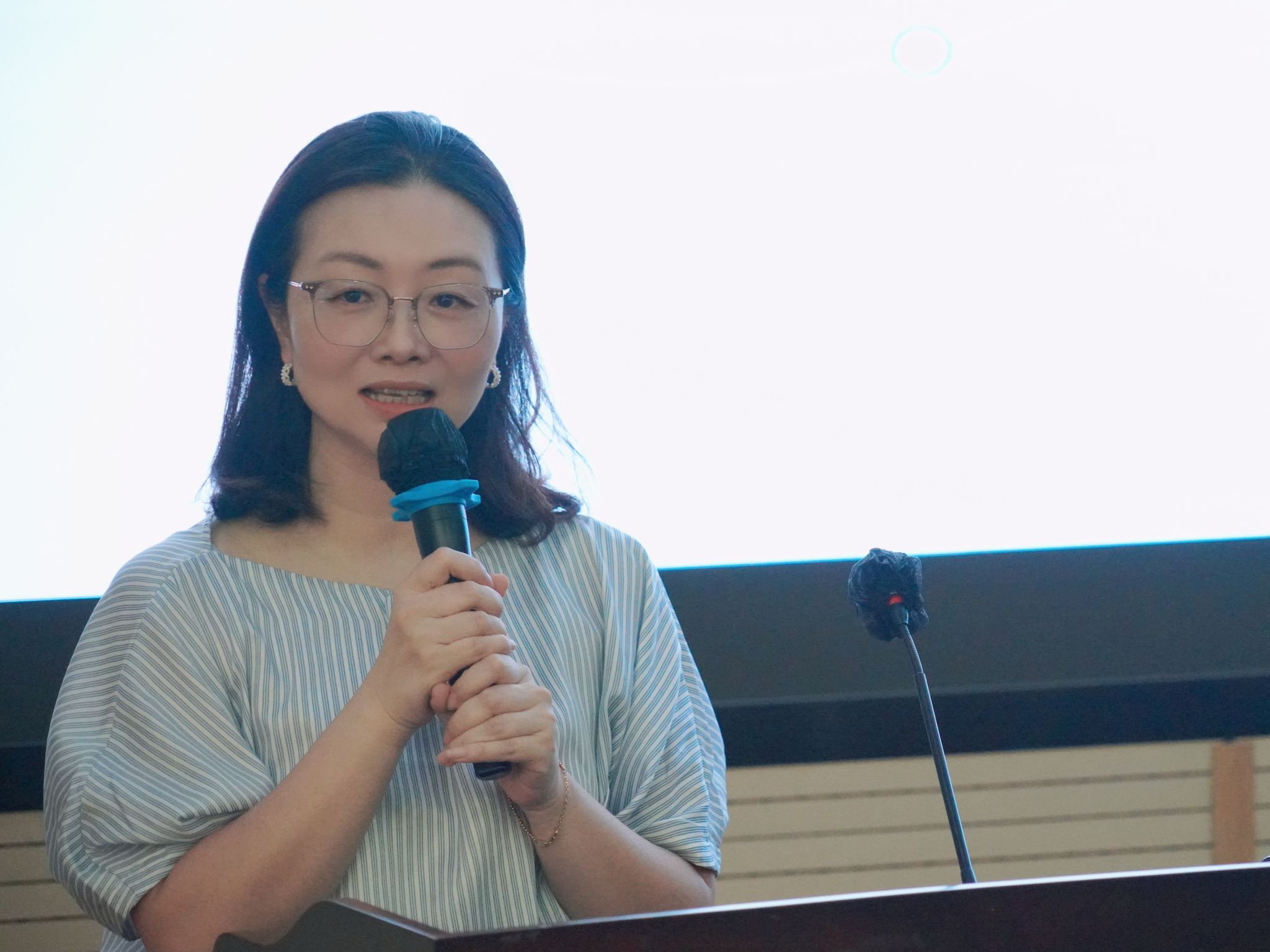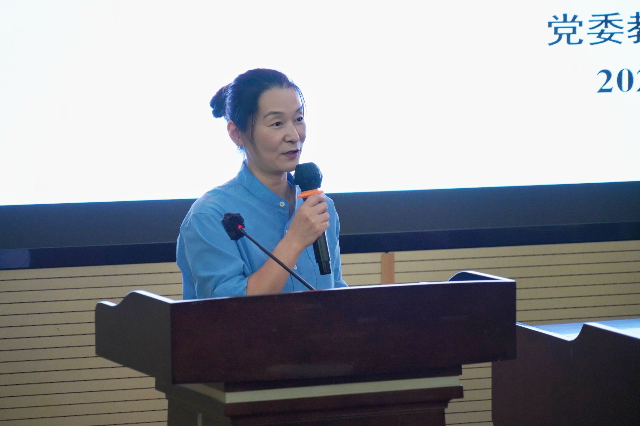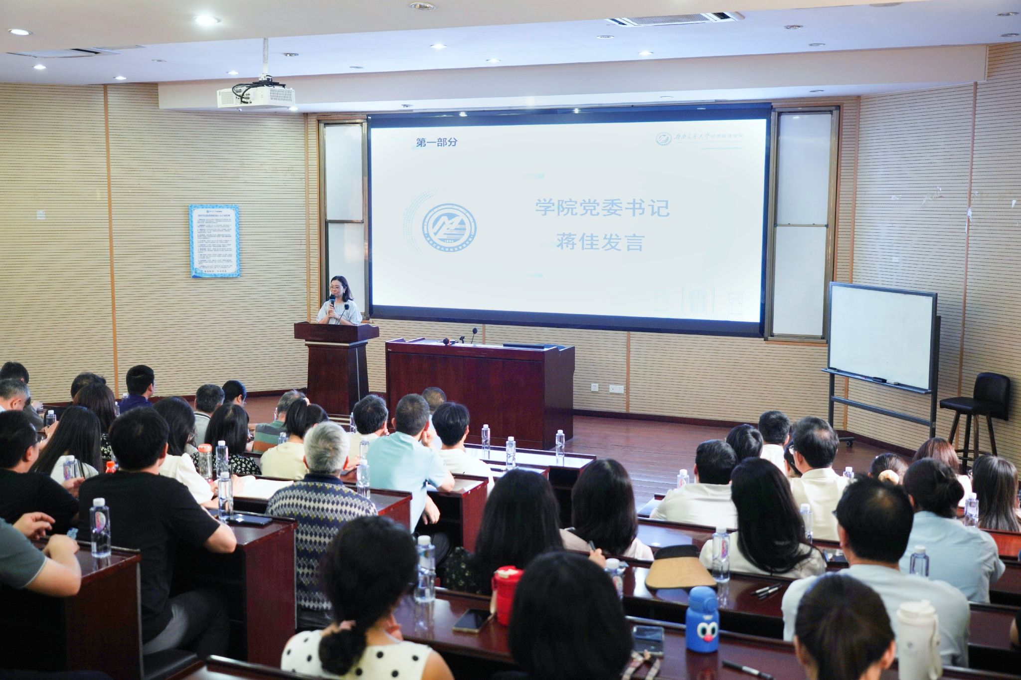 学院党委书记蒋佳发言。蒋佳回顾了自身在教育教学与党建工作中的实践经历,对学院全体教职工的信任与支持表示感谢。蒋佳指出,今年会全体教职工在基层党建、服务师生、学科研究、人才培养等方面做出了突出贡献,愿同全院教职工共同携手,共同书写今年会高质量发展的新篇章。
