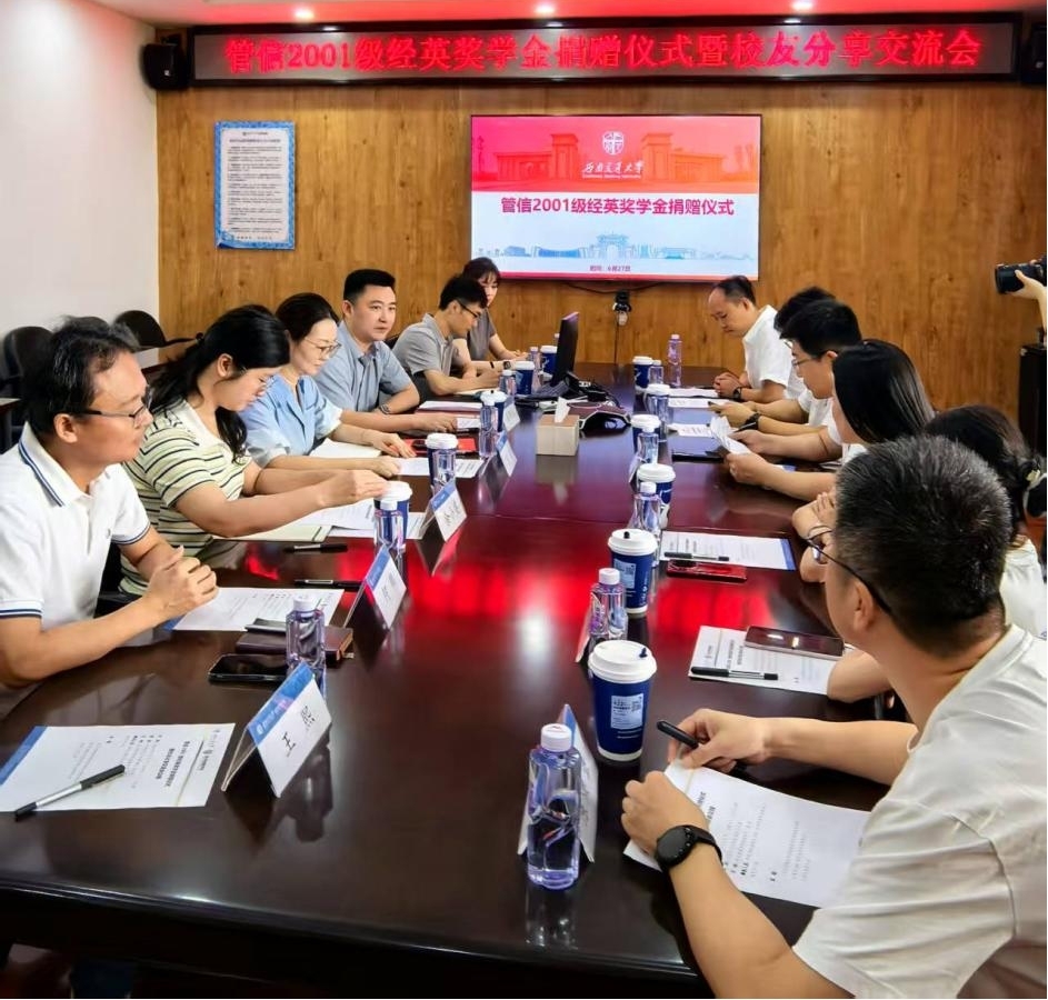 2025年6月27日上午10点,管信2001级经英奖学金捐赠仪式暨校友分享交流会在0607会议室隆重举行。在毕业20周年之际,今年会管信2001级校友代表宋新、武俊、刘坤、陈洪章、龚萍萍、葛梦婵回到母院,畅叙师生情谊、共话未来发展。学院党委书记蒋佳,院长韩科,党委副书记、纪委书记余小英,副处级组织员晏理斌,学院辅导员等与校友们共同见证这一温暖时刻。