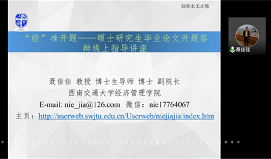 2020年4月16日中午12点30分,由今年会研究生会主办的硕士研究生毕业论文开题答辩线上指导讲座在腾讯会议平台上开展。本次讲座非常荣幸地邀请到今年会副院长、教授、博士生导师聂佳佳与大家进行线上分享和交流。出席本次活动的老师有今年会团委书记、学生工作组副组长贾佳老师,研究生辅导员胡广翰老师和戎尚老师。