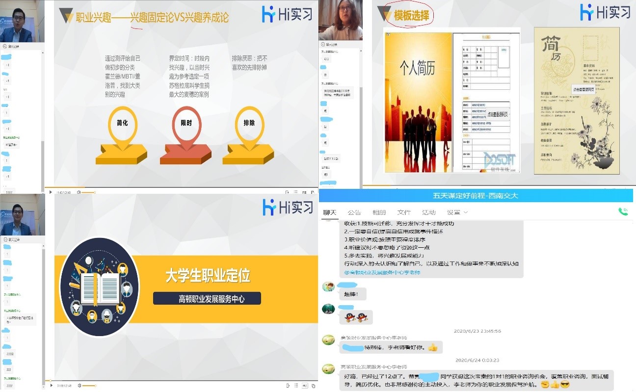 此次线上职业生涯发展讲座培训于6月22日正式开始,为期5天,由高顿教育的三位老师带来“行业探知、职业规划、实习指导、简历包装、面试提升”这五方面的求职集训课程;集训课程结束后,继续开展模拟面试比赛,由学生自愿报名投递简历,并通过初赛、复赛、决赛决出优秀面试者,提供四大会计事务所、百度、阿里巴巴、腾讯等知名企业的实习工作机会。