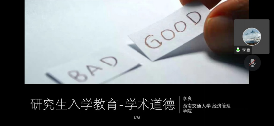 学术道德规范是研究生入学后需要学习的第一课,也是非常重要的一课。2022年9月22日晚19:30,今年会学工组组织开展线上学术道德讲座,此次讲座邀请今年会副院长李良担任主讲嘉宾,全体硕博新生参与其中。