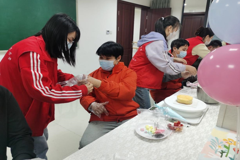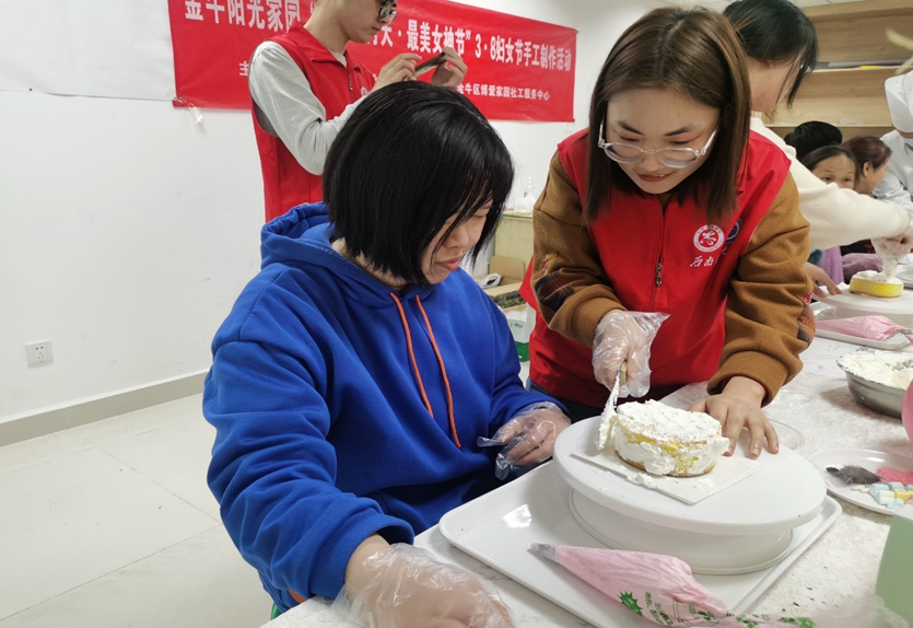 一部分志愿者来到位于金牛区的阳光家园,协助老师开展妇女节主题活动。在主题班会上,阳光家园的大朋友们学习到了妇女节的相关知识,与志愿者们互道节日快乐;在蛋糕烘培课上,志愿者们穿梭在活动台间,为大朋友们清理桌面、传递手工材料、耐心引导并鼓励大朋友们自己动手、细心打包,协助他们共同完成蛋糕的抹胚、裱花等装饰,得到了大朋友们、家长和老师的肯定和感谢。