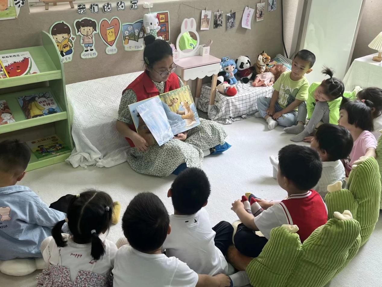 在教室的阅读角,小班的孩子们阅读了《我爱你,比永远还要多一天》。孩子们在志愿者绘声绘色的表述下不知不觉间沉浸到故事中,主动分享自己在阅读中的体会和收获,理解了爱需要勇敢真诚地表达出来。