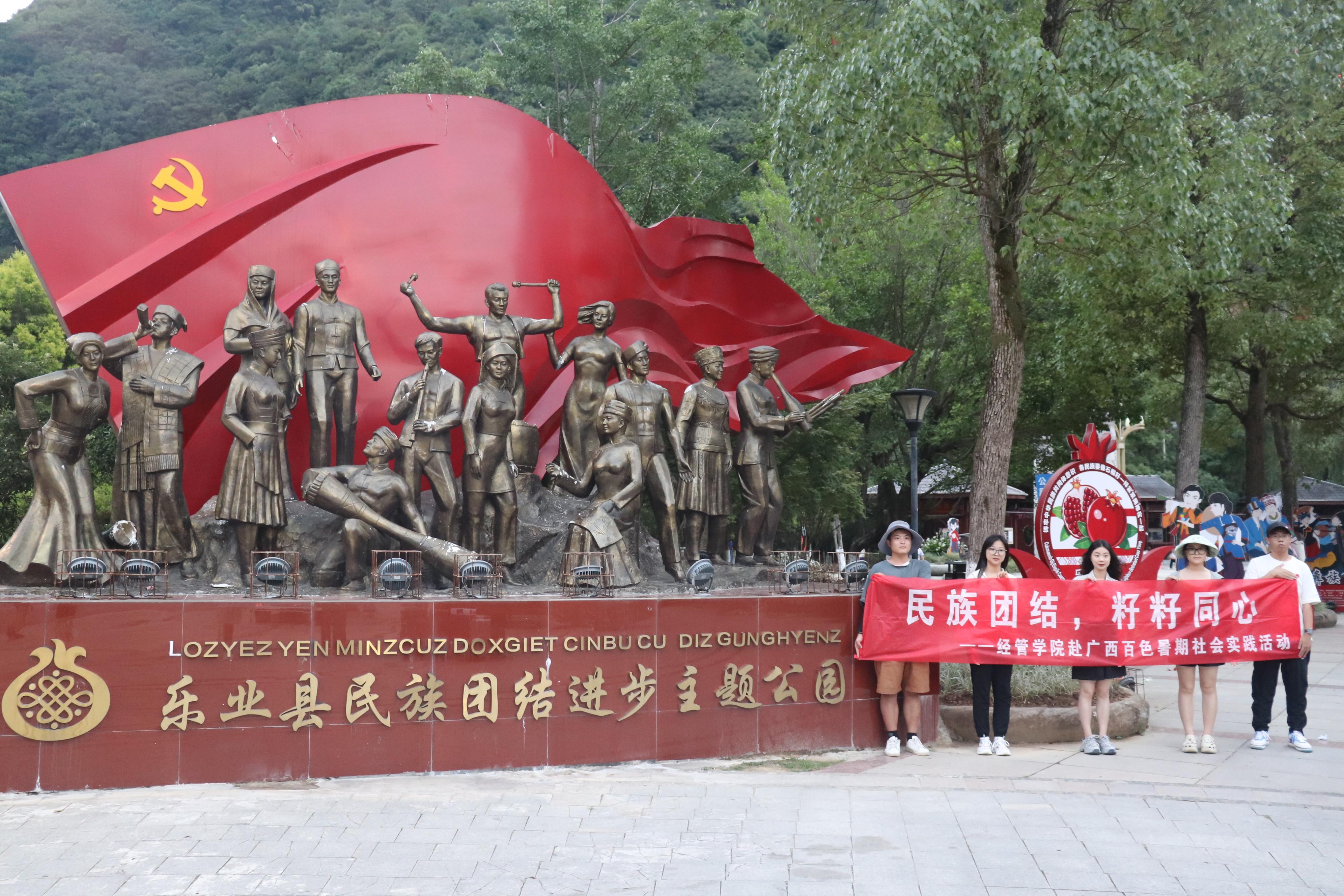 7月6日下午,实践队前往百色市乐业县民族团结进步主题公园调研。主题公园以“红色资源+民族团结+自然风貌”的展现形式,充分利用当地自然资源和红色资源,与乐业县红七红八军会师纪念馆、罗妹莲花洞景区等进行连片打造,融入社会主义核心价值观、民族政策、民族知识等宣传教育内容,丰富了民族团结进步宣传教育的形式和载体,营造“中华民族一家亲,同心共筑中国梦”的浓厚氛围。